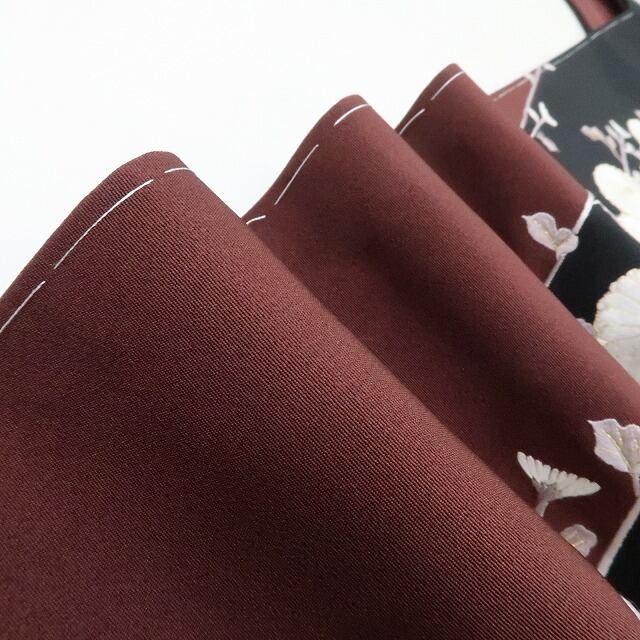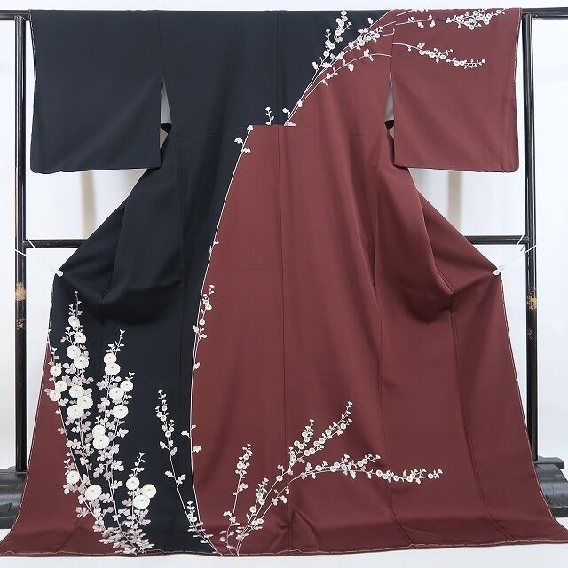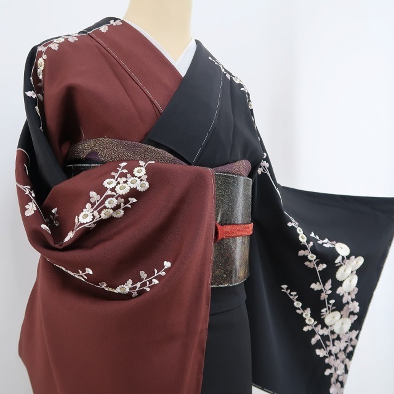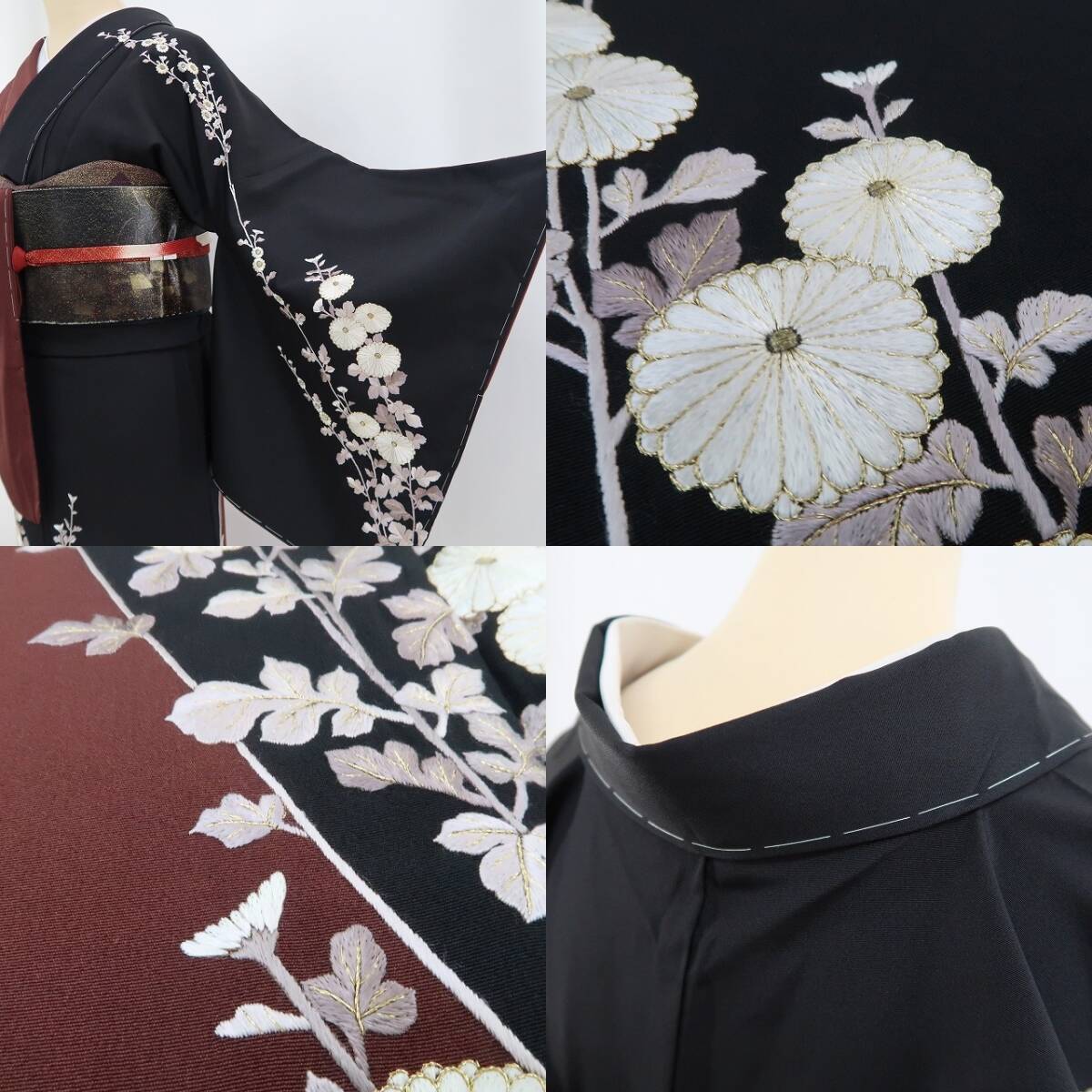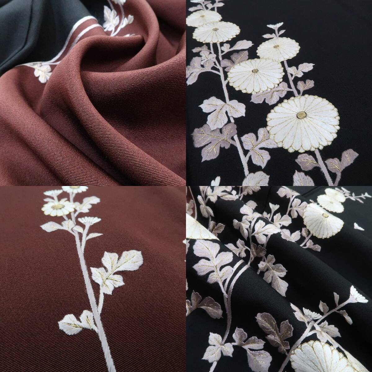 黒と小豆色の彩色が誘うこの上ない落ち着きの表情、色分けの構図に生き生きとした鼓動を放つ刺繍の花、シンプルなテーマながら巧みな意匠が醸し出す艶めいた着物の奥行、それは卓越した技術に優れた感性と繊細さが創り出す刺繍着物の美しさ、総刺繍の贅なれども嫌みのない上品な趣…奥深い大人の装いがお楽しみいただける極上のひと品でございます。