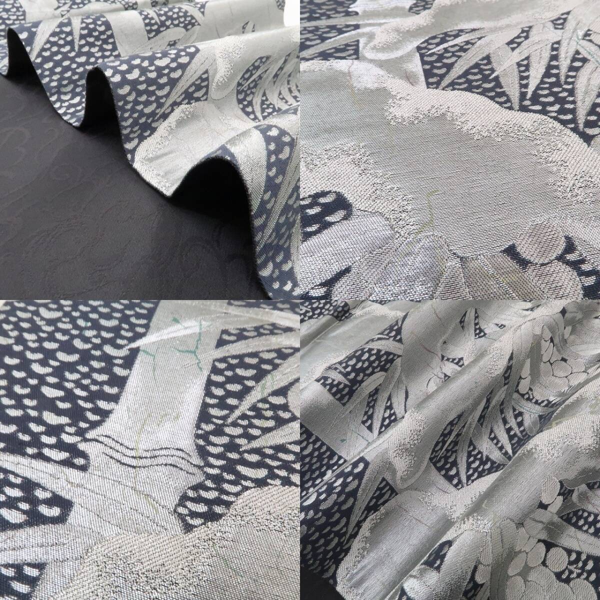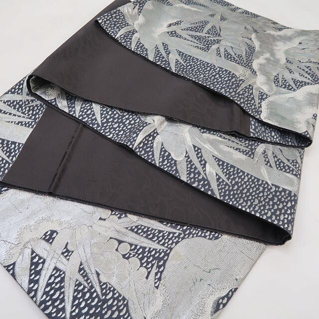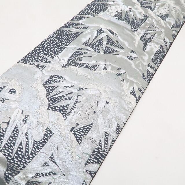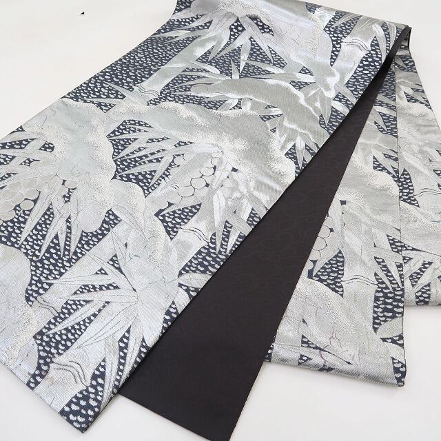 青褐色×シルバーで「難(ナン)を転(テン)じて福となす」の語呂あわせから、厄災を除け、縁起のよい木とされてきた南天、歳寒三友の一つとして中国で古くから愛でられ、高潔で節度を保ち、しなやかでいて折れない強さを持つ竹に雪を組み合わせ、今の時期を物語り、見方を変えれば、その雪を持つ姿が笠松にも見え、季節の移りと共にその雰囲気を楽しめる、“雪持笹南天”正絹袋帯でございます。