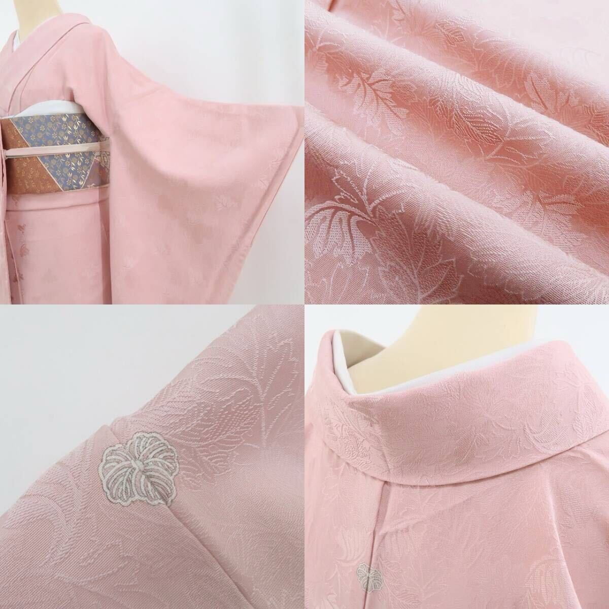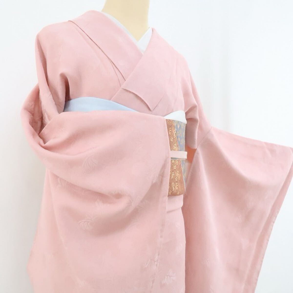 大人びた表情を魅せる艶めいた鴇色(着付け画像をご参考ください)の彩色、花葉を刻み全面を覆い尽くす精微な地紋の美しさ、それは色彩に同調し鮮烈なインパクトを残す色の軌跡、極上に大人のセンスを感じさせてくれるひと品、ほのかな色香に染まりながら貴女へ上質の高揚感を届けてくれます。