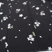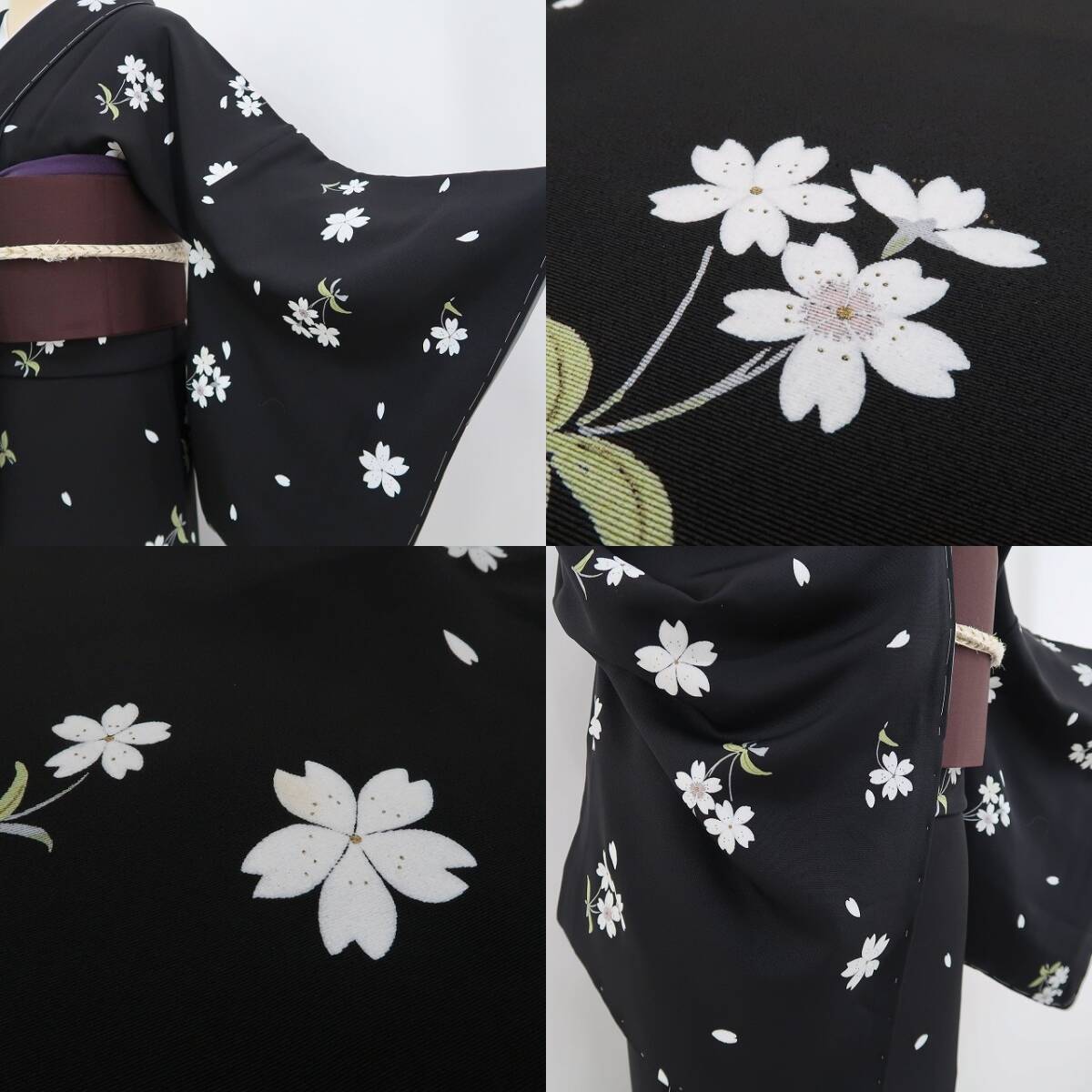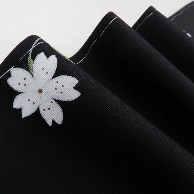 黒で開く夜のしじまに水際立つ清らかな色で花開き、ハート形の可愛らしい花びらを散らして情緒を誘うシャワーを解き、仲良く寄り添い、自分時間も無垢な微笑みで楽しみ、悠々自適に花咲く桜がまるでVlogを見せるかのように舞う、“桜”正絹仕付け糸付小紋でございます。
