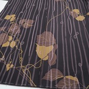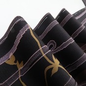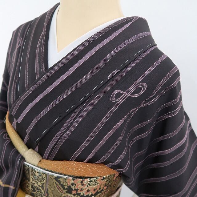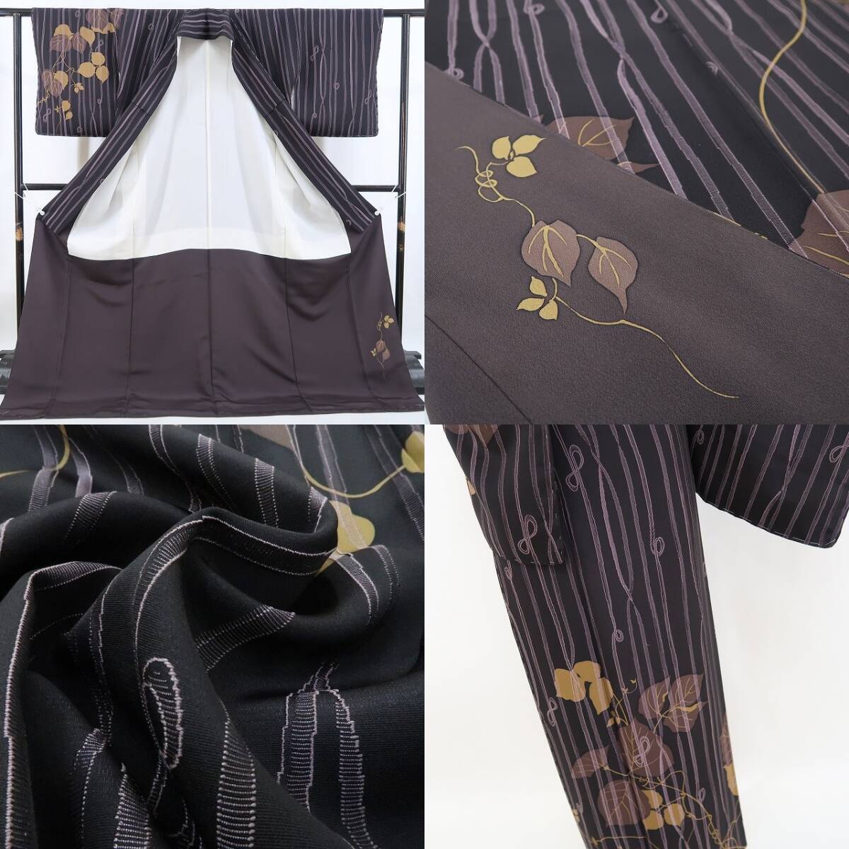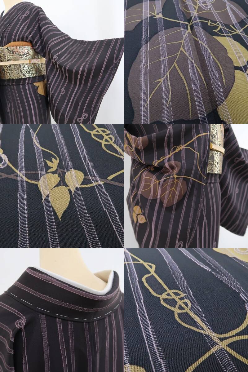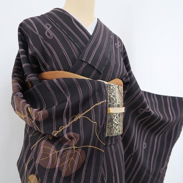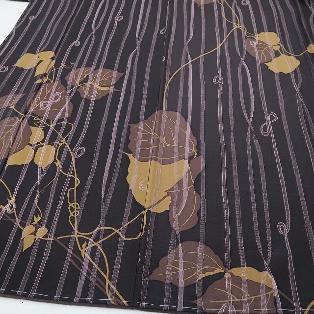 丸みある紫黒色の地に濃淡を映す趣豊かな蔦葉の一景、縦縞状の構図に醸し出されるえも言われぬお洒落感は必見の価値あり!それは正に今をときめく創作着物の魅力そのもの…考え抜かれたデザイン力が創り出す心地よい和のハーモニー、素敵です。