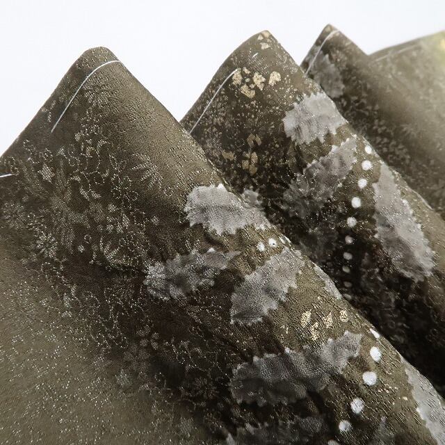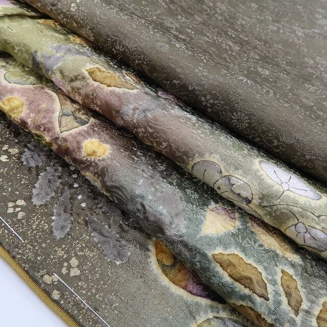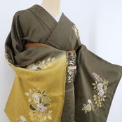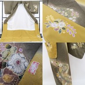 柳煤竹色×芥子色を舞台に物語のように花開く辻ヶ花は、月から降り立った桜や梅、紅葉の花々が淡い光を帯びて幻想的に翔け、一面に繊細な鼓動を響かせる菊や梅、桜や笹、鳳凰と共に大きな流れをつくり、これから夢のような美しさを永遠に咲き誇る慶びの場所へと繋ぐ、翠山工房 徳永憲峯落款“辻ヶ花”絞り仕付け糸付トールサイズ訪問着でございます。