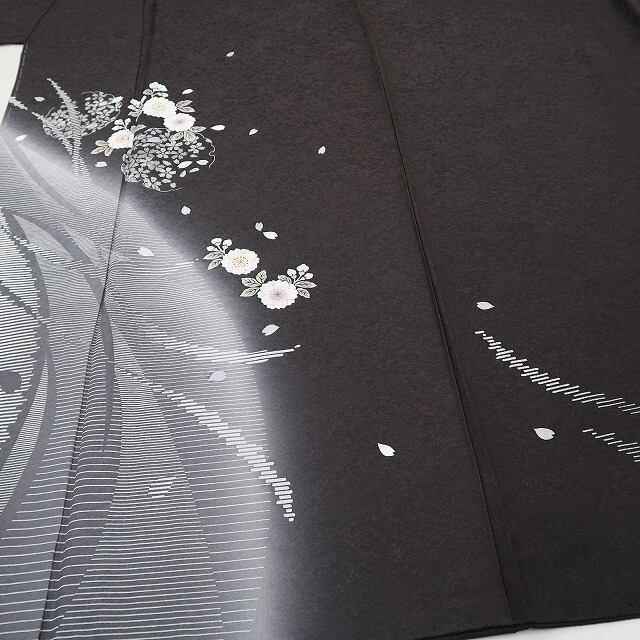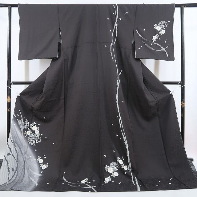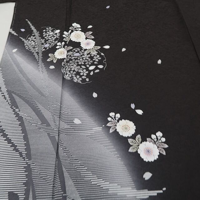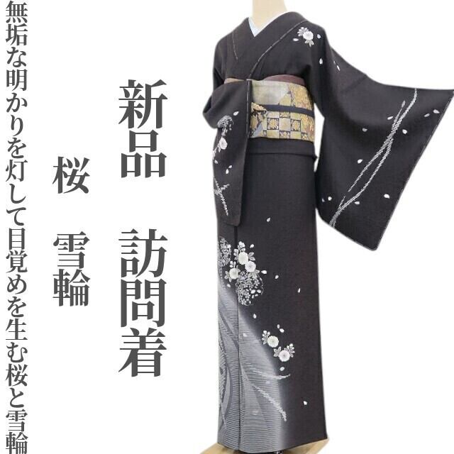 ひらひらと舞う花びらが情緒を誘い、純粋無垢な微笑みに縞を操り生み出す擦れたような表情を巧みに花開く桜と芝草が風に揺らめきながら雪輪と共に鉄黒色の静寂に歩みを進め、自然と明かりを灯して静かな目覚めを生む、“桜”雪輪 正絹 仕付け糸付訪問着でございます。