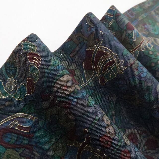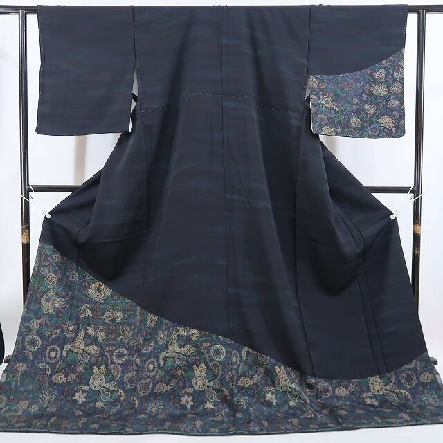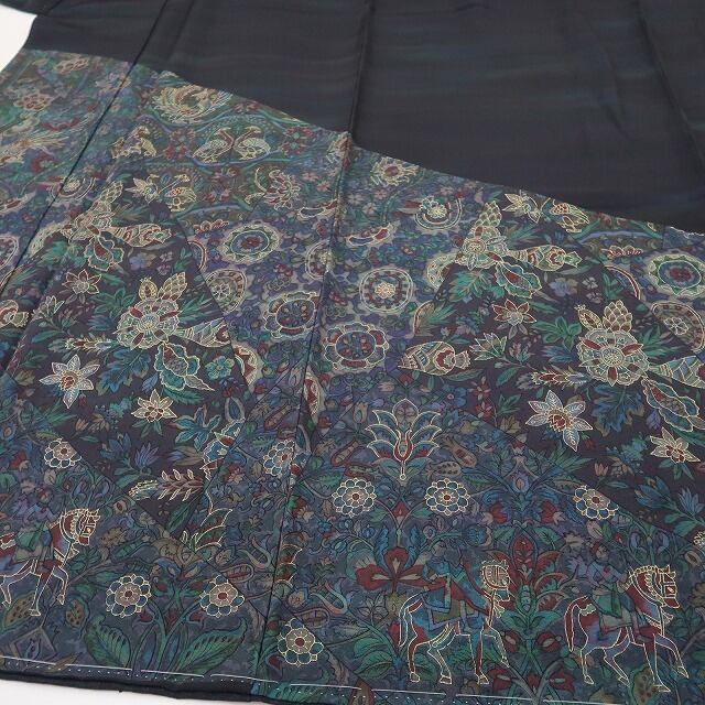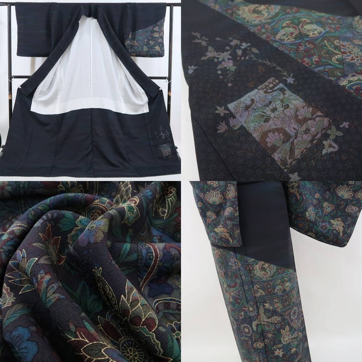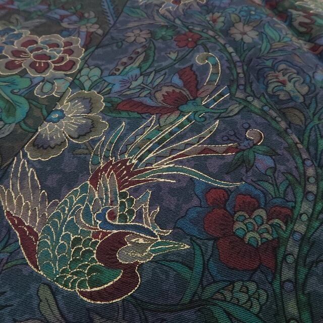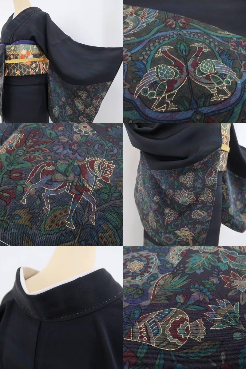 こちらのお着物は、ダークトーンの彩色で意匠の美しさにフォーカスしたデザイン性の高い動物更紗を込めています。緻密にして過飾にならず…個性の着姿を表現するのに最適なお召し物です。