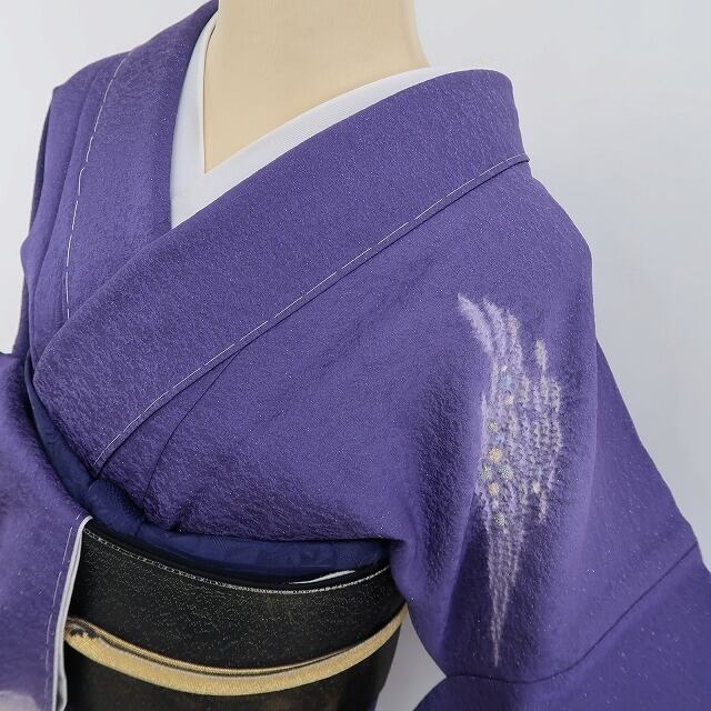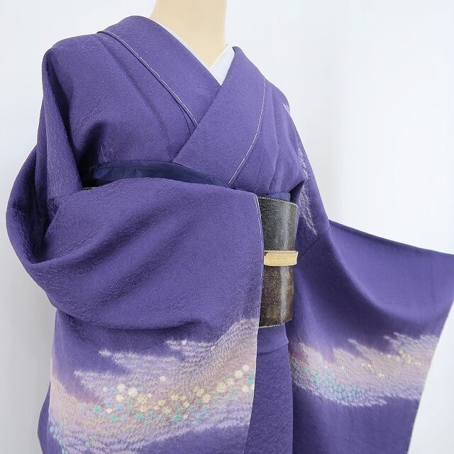 柔らかな菖蒲色で色付けされたおぼろ染めの濃淡、巧みな構図に小花の流線が描き出す洗練のデザインライン、そして銀通しの重厚感に相良刺繍が添える極上の艶、それは正に“奥深い染めのファンタジア”、お洒落な貴女の装いの満足度を届けてくれること間違いなし。