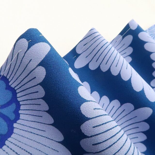 一面を整然と敷き詰める七宝、その姿を追いかけると、花びらを亀甲型に遊ばせる菊から優美に微笑む桜へと変化、また見る角度や所作で立体的に見え、見る者の想像力を掻き立ててまた違う顔を花開く、“正絹”仕付け糸付小紋です。