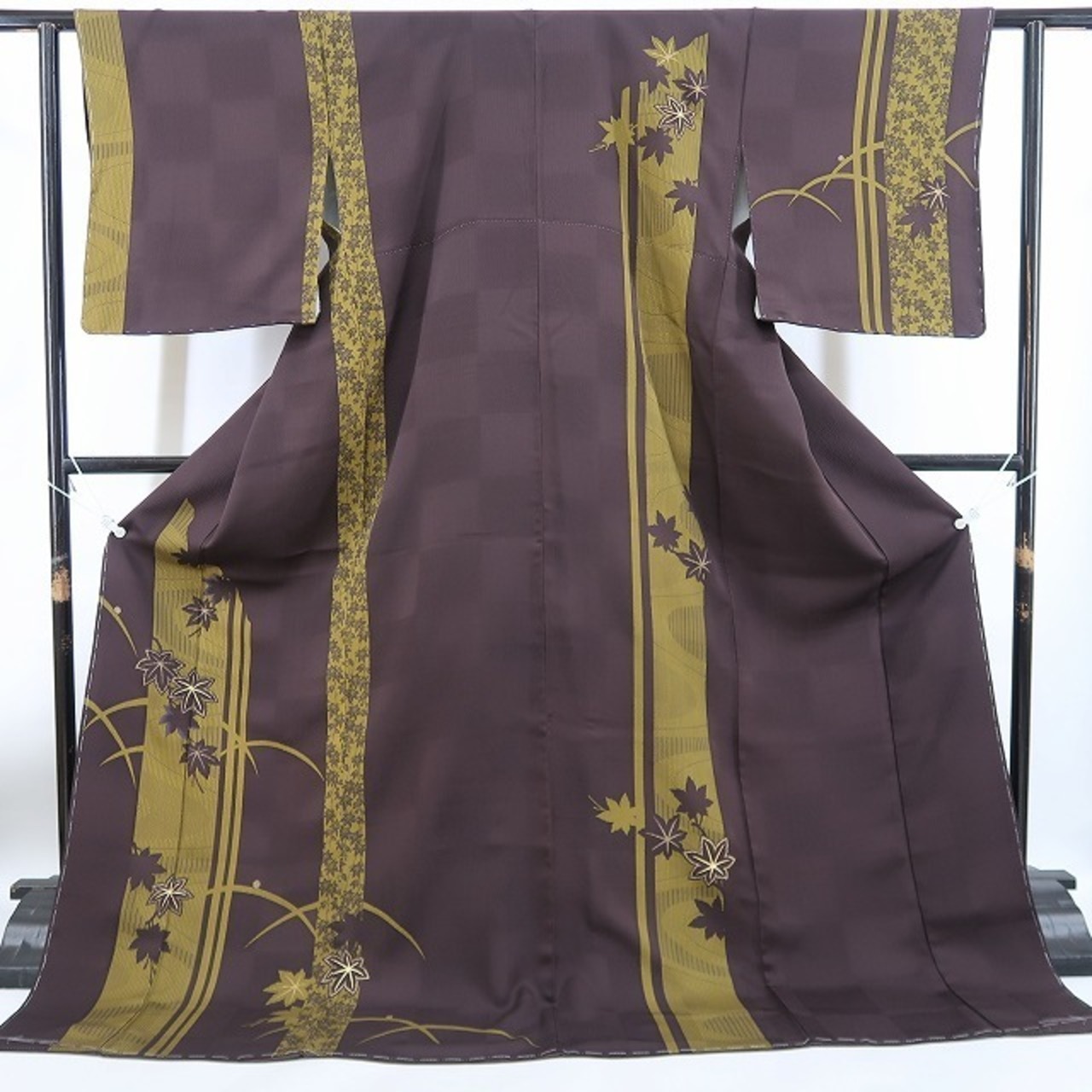 ほんのりと懐かしさを漂わせて静かに構える市松に降り注ぐ光には、細やかな水玉とい縦縞を巧みに操り、飛び飛びの線で成す洒落た流水に紅葉が息づき、さり気なくおめかしをして影を流水に預けた紅葉が活きな光から抜け出し、軽快なステップを踏む露芝と共に舞台を翔けて風流を運ぶ、“紅葉”正絹仕付け糸付訪問着でございます。