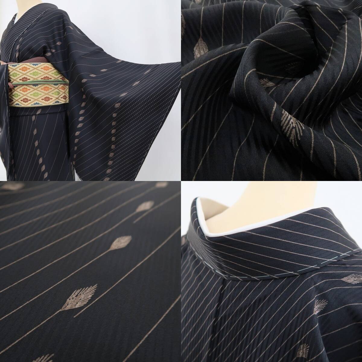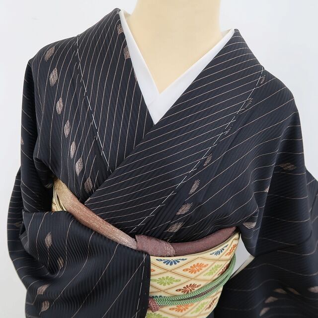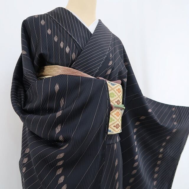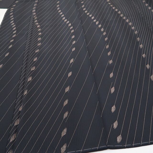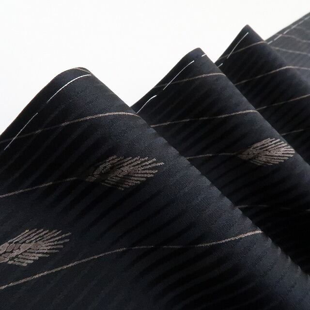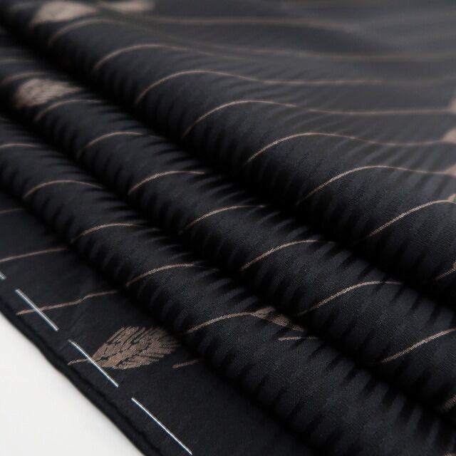 よく見ると静かに静かに縦縞を広げる黒が打つ静寂に飛び飛びの足跡で緩やかな流線を描くよろけ縞、まるで流れ星のように翔ける縞、静寂の中に響くその鼓動を追いかけると、その姿は、風に揺らめき実りを想像させる穂...。袖を通せば、ふとした時に見え隠れする八掛に神々しい実りをつけ、目にする者におすそ分けをする、「中町明」落款正絹 仕付け糸付 トールサイズ小紋です。