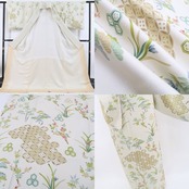 大変縁起の良い松竹梅や紅葉、亀甲や七宝が淡く優しい自然味豊かな色付きでどこか可愛らしさを見せながら見え隠れして歓びを歌い、穏やかな時をやりすぎない華やかさで晴れの舞台と成し、その時その場の主役を引き立て上手に華を添える大人の晴れ姿へとつなげる、正絹仕付け糸付訪問着でございます。