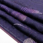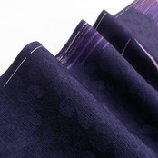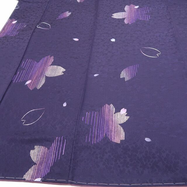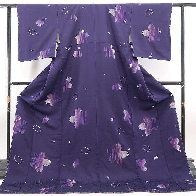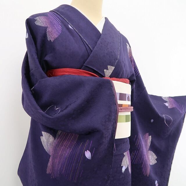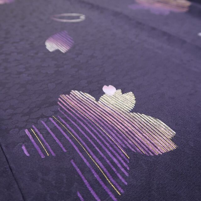 落ち着いた深紫色の地が放つ大人びた艶、巧みな構図で散らされた花小柄のデザインモチーフ、それは桜の愛らしいシルエットが照らし出す創作着物の粋な奥行、モダンなタッチで描き込まれた柄行の濃淡が着物に艶を吹き込むかのような趣で美しい表情を奏でています。