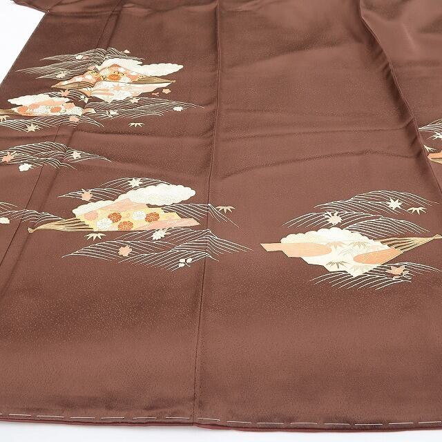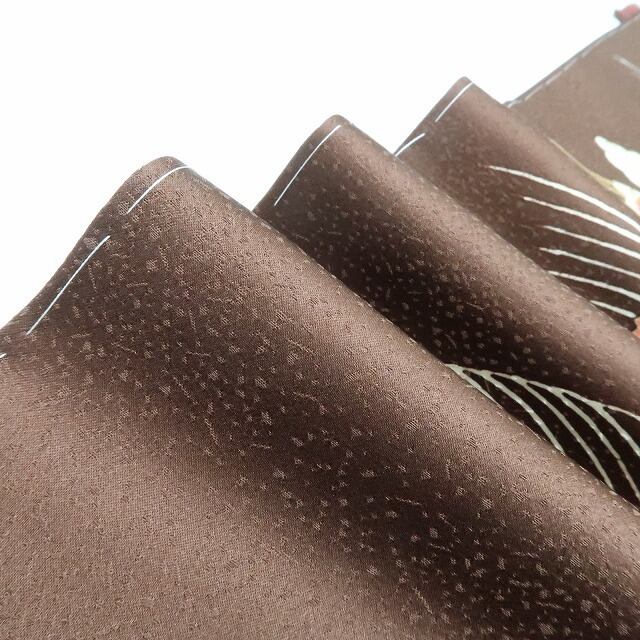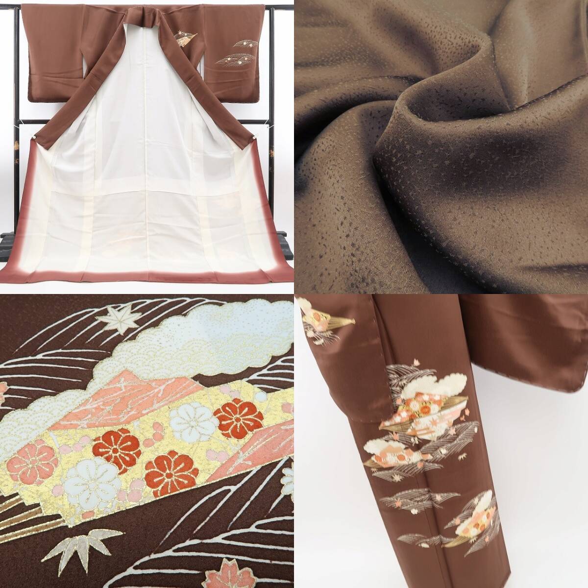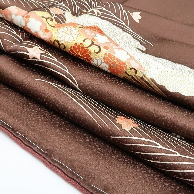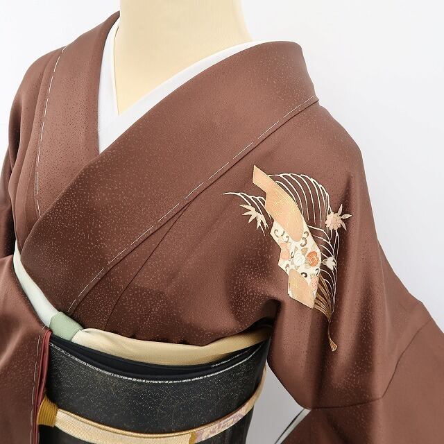 光沢ある茶褐色の地に描き込まれた花と和柄の組み模様、波の流線に創作小柄が奏でる心地よい温もり、そして金駒刺繍の煌きが添える極上の艶、それは正に“和に触れて色付くこころ”…美の極みに触れ至極の着心地があなたに充実したひと時を運んでくれることでしょう。