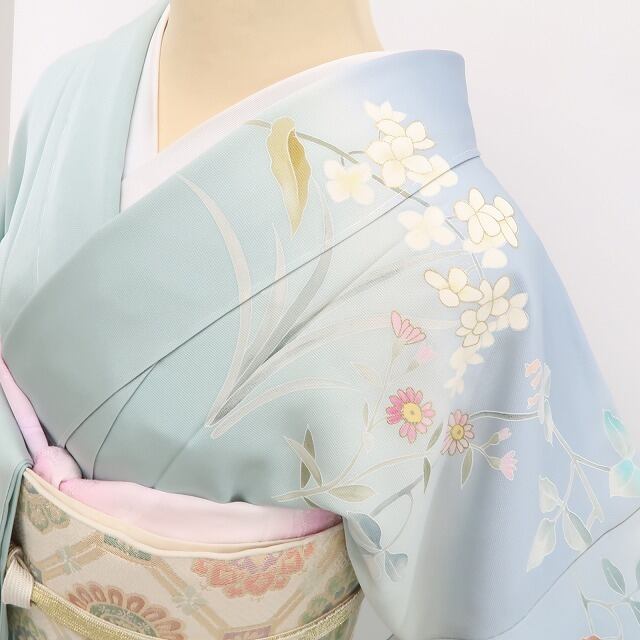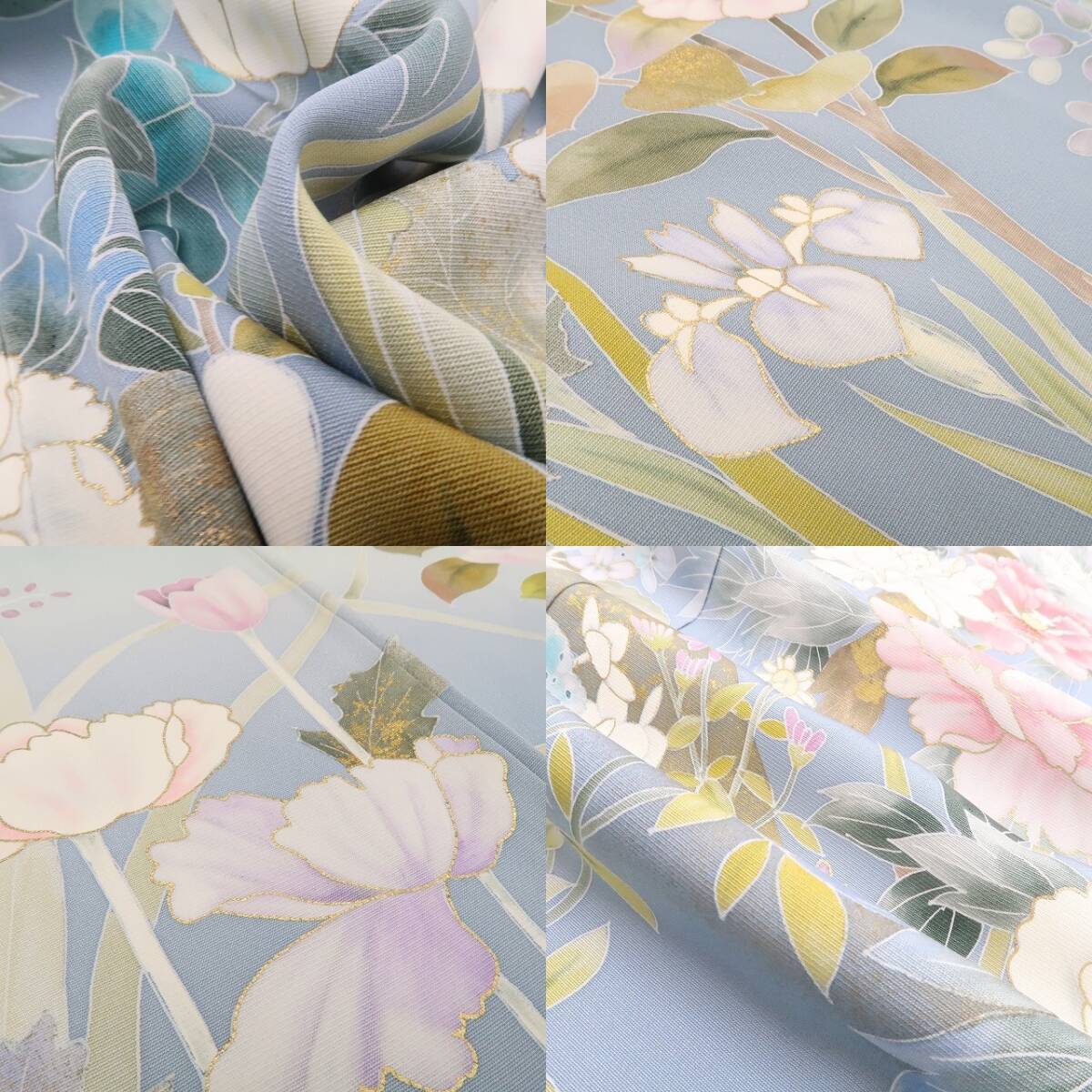 こちらのお着物は、ペールトーンの彩色で染めの美しさにフォーカスした季節の花景を込めております。どこまでも楚々として慎ましく…嫌みのない大人のセンスを魅せるのに最適なお召し物です。