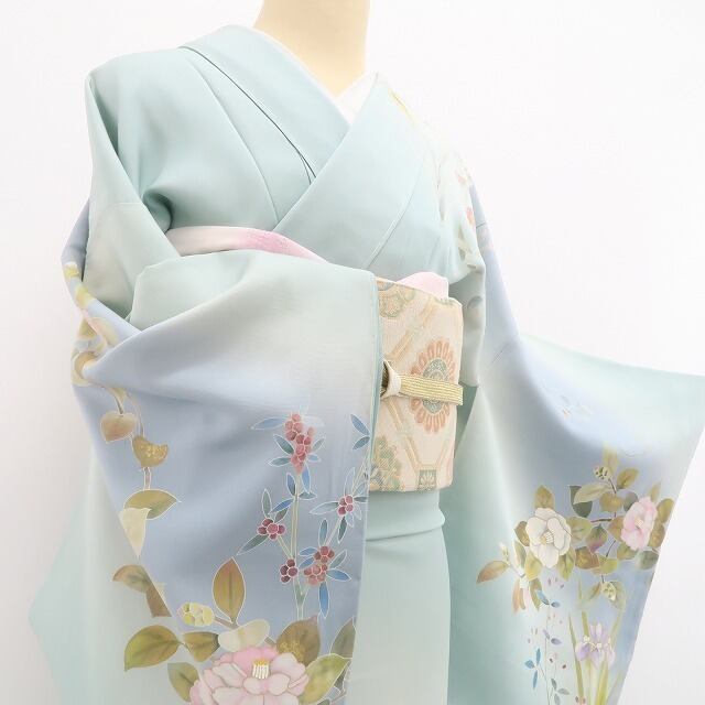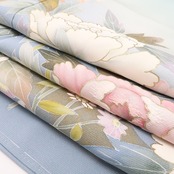 白群色と紺鼠色の柔らかな濃淡に描き込まれた季節を映す和花の一景、牡丹や椿が魅せる温もりの表情に色挿しの慎ましさが添える楚々とした着物の奥行、そして意匠全体に醸し出される極上の艶、季節の装いに…美の極みに触れ至極の着心地があなたに充実したひと時を運んでくれることでしょう。