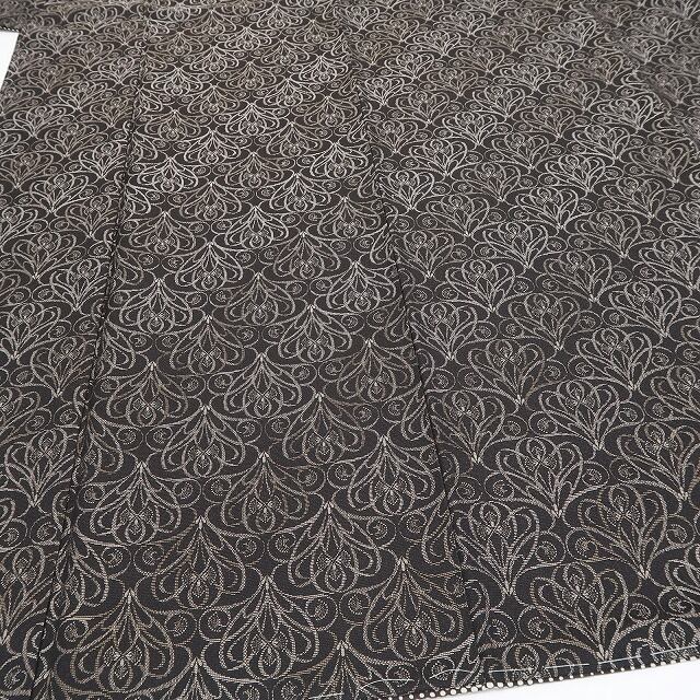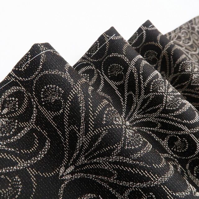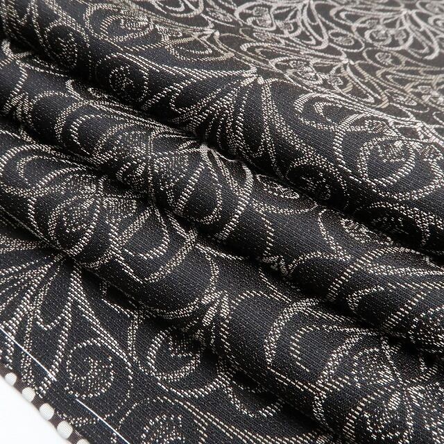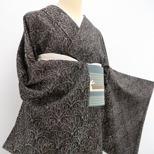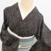 大人びた黒茶色の地全面に描き込まれた花をモチーフにした創作和柄の繋ぎ柄、シンプルながら意匠に醸し出されるえも言われぬお洒落感、それはモダンお召の粋な奥行、“西陣まいづる”が創り出す洗練の風…手くくり手摺り込みによる絣糸を一本一本合わせながら織り上げるお召の味わい、独特のしっとりとした風合いが着物の味わいを一段と馴染みやすい趣に変えています。