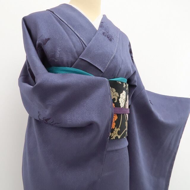 艶めいた鉄御納戸色(光の当たり方によってお色が異なって見えます)の彩色、全面に刻まれた豊かな地紋の美しさ、それは鮮烈なインパクトを残す桐竹鳳凰文の気高き表情、シンプルながらも極上に大人のセンスを感じさせてくれるひと品、ほのかな色香に染まりながら貴女へ上質の高揚感を届けてくれます。