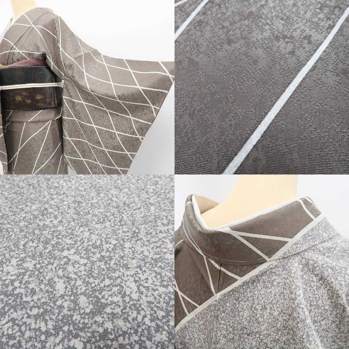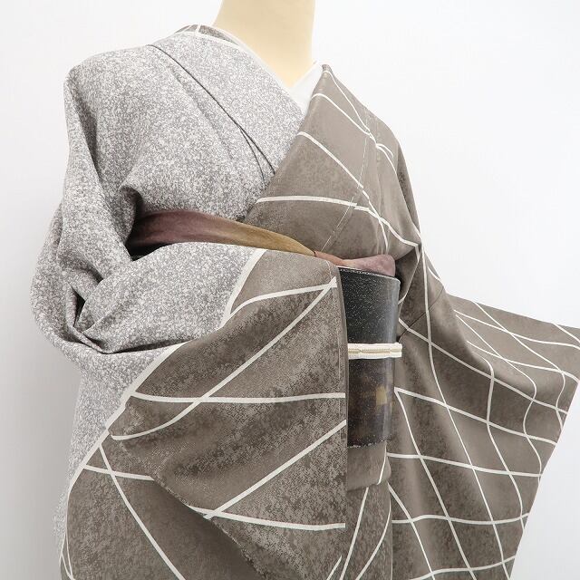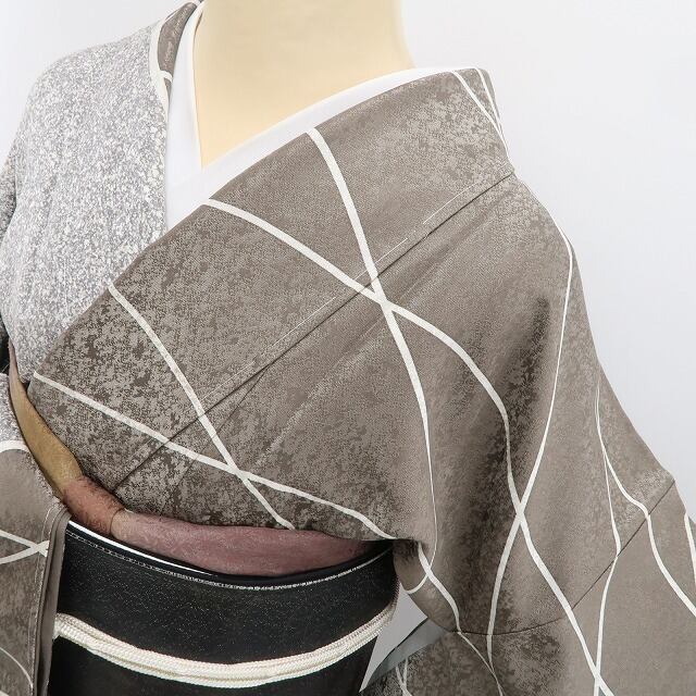 大人びた灰汁色とグレーの色分けに引かれた放射線状のデザインライン、斬新な意匠に醸し出される寿光織のこの上ない高級感、正に名工“小糸敏”の技が惜しげもなく注ぎ込まれたひと品、歴史を感じながら美しい着物に袖を通す至福のひと時…落ち着きを魅せる女性らしさに溢れ出す和の風情を存分にお感じいただけることでしょう。