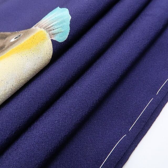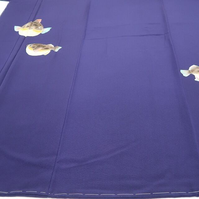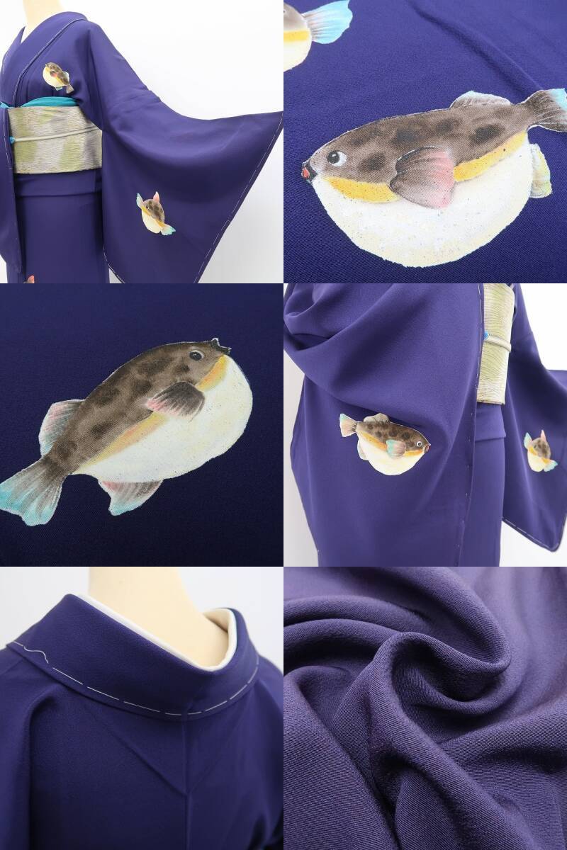 深みある鉄紺色の彩色が誘うどこか大人びた艶、付下げの構図にお道化た表情を魅せる愛嬌フグのデザインモチーフ、それは“おとな色に和を奏でるモダンな感性”、丁寧な柄付けと創作物ならではの独創性が魅力、ダイレクトに和装の醍醐味を味わえるひと品です。