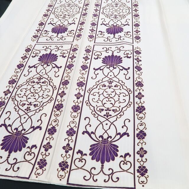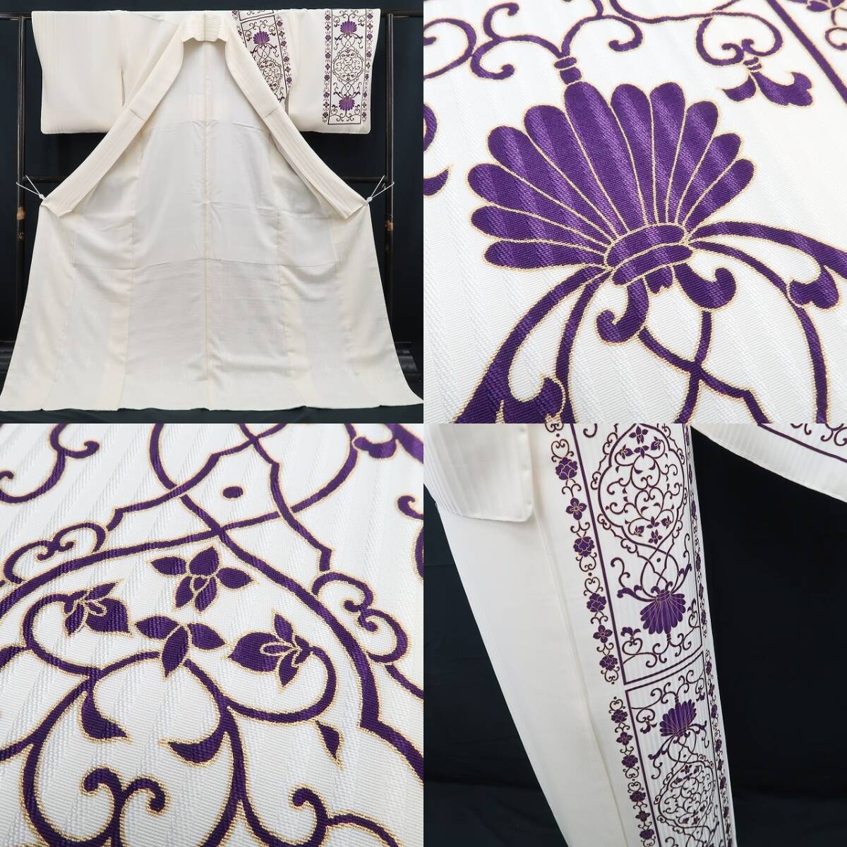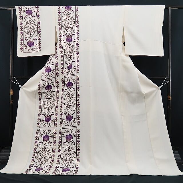 丸みある象牙色の地が放つ楚々とした艶、縦状の構図に繋がれたデザイン唐草の色模様、ダイレクトに視線を射止める意匠力は“BANKAN”ならでは、アシンメトリーながら左右バランスのとれた柄行きが着物に落ち着きを与え、大人びた着物の華がものの見事に表現されています。