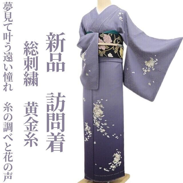 新品 総刺繍 黄金糸 着物“夢見て叶う遠い憧れ…糸の調べと花の声”正絹 仕付け糸付 訪問着 5417