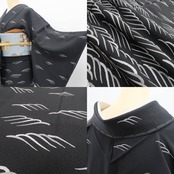 シックな黒の色地に付下げの構図で描き込まれた趣豊かな波模様、シンプルながら意匠に醸し出されるえも言われぬお洒落感、左右バランスのとれた柄行きが着物に落ち着きを与え、大人びた着物の華がものの見事に表現されています。