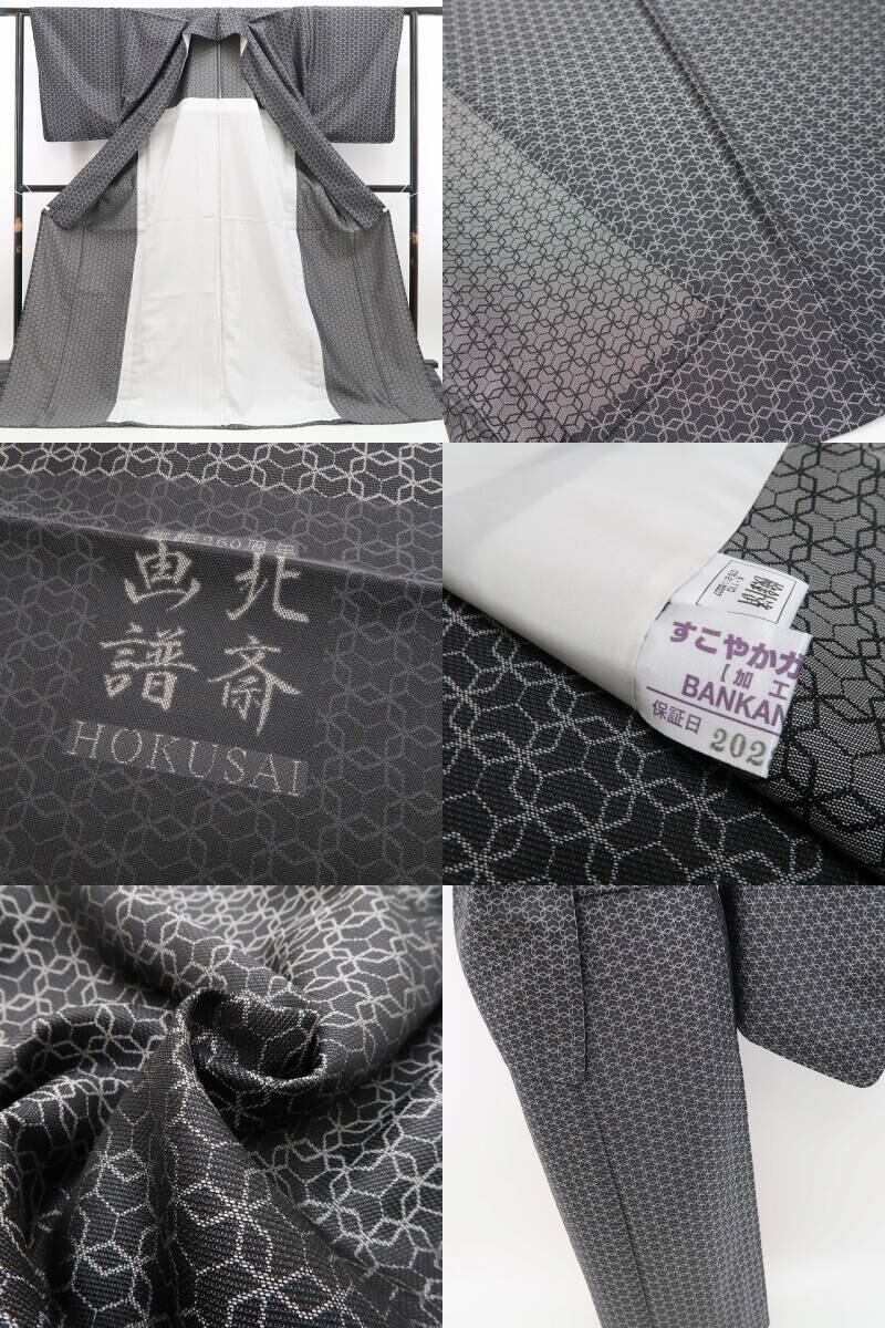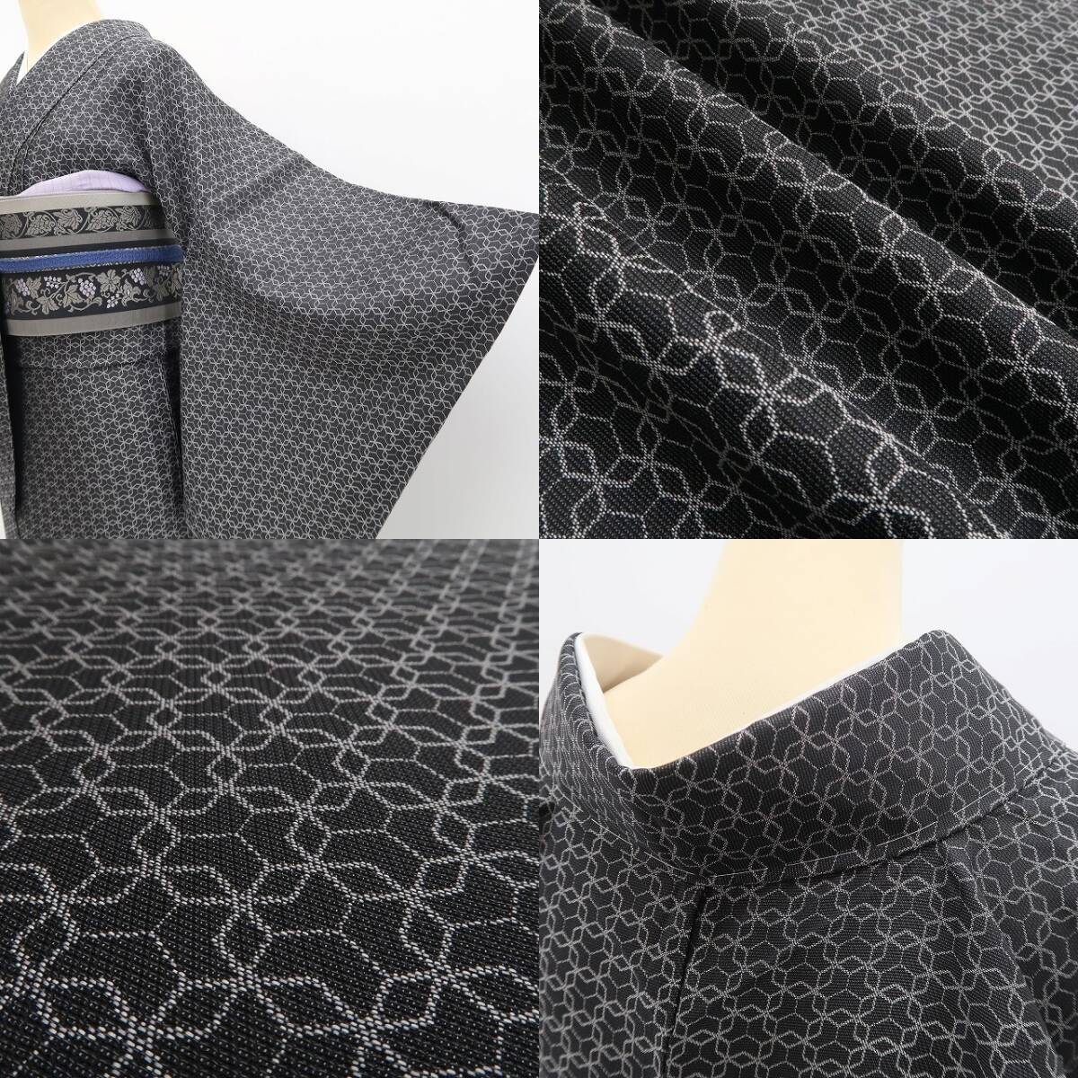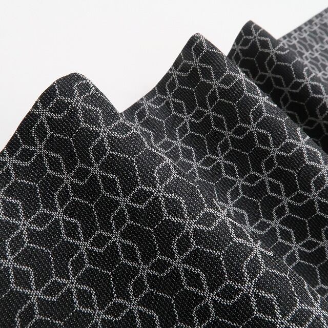 シックな黒の色地全面に描き込まれた北斎画譜のデザインライン、規則的なラインパターンが創り出すこの上ないお洒落感、お召本来の素材感を最大限に活かしながらも柄付けなどを現代感覚にアレンジしたひと品、シンプルながらもしっかりと主張する意匠性…“洒落味を楽しむ大人の趣向”として貴女のお気に入りになること間違いなし。