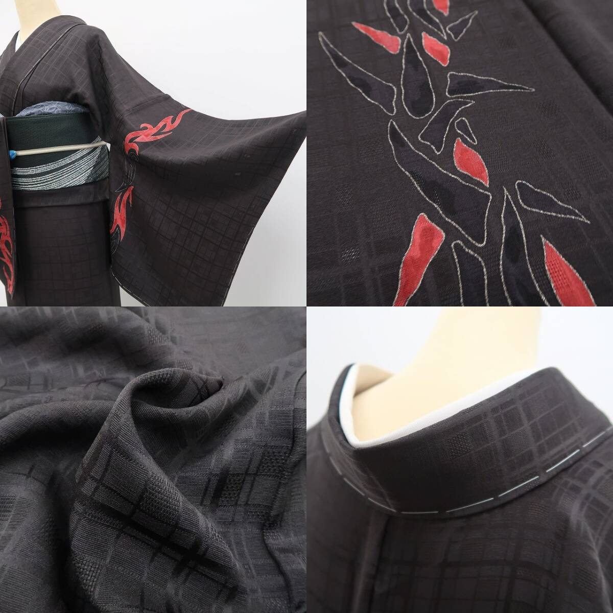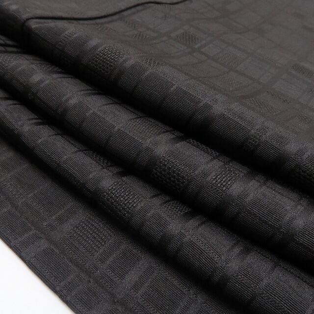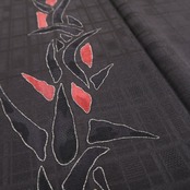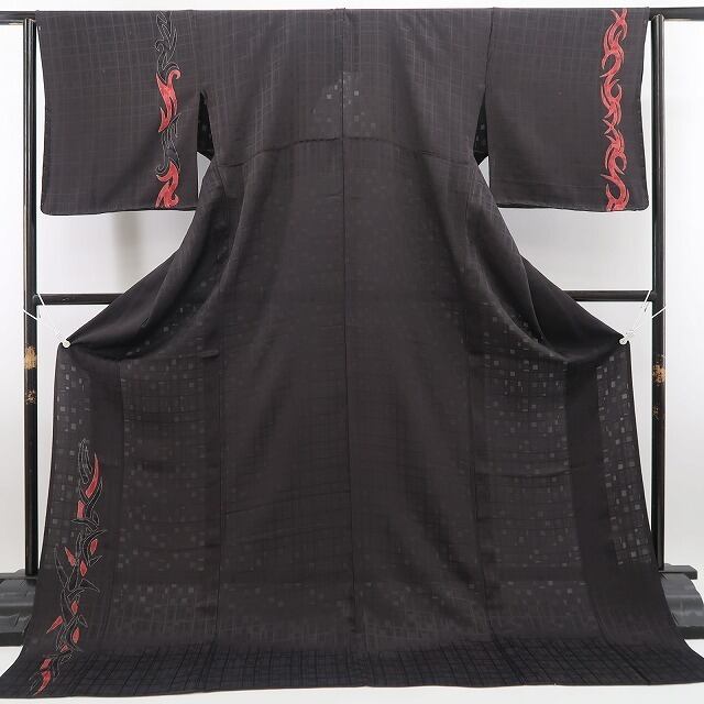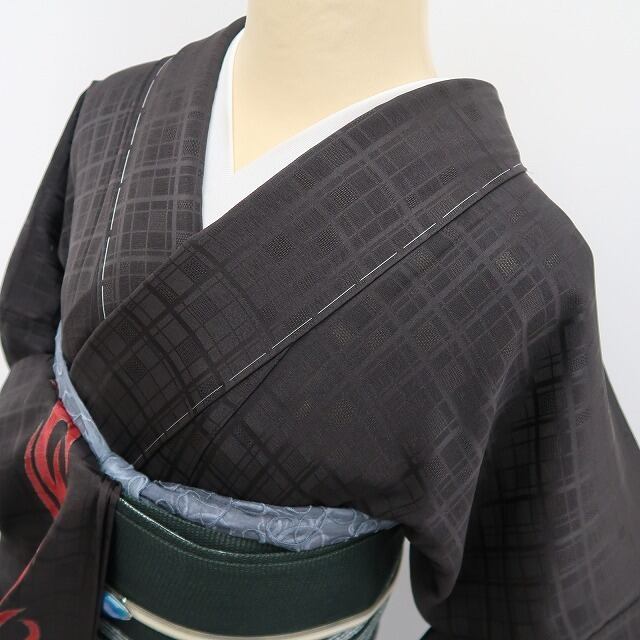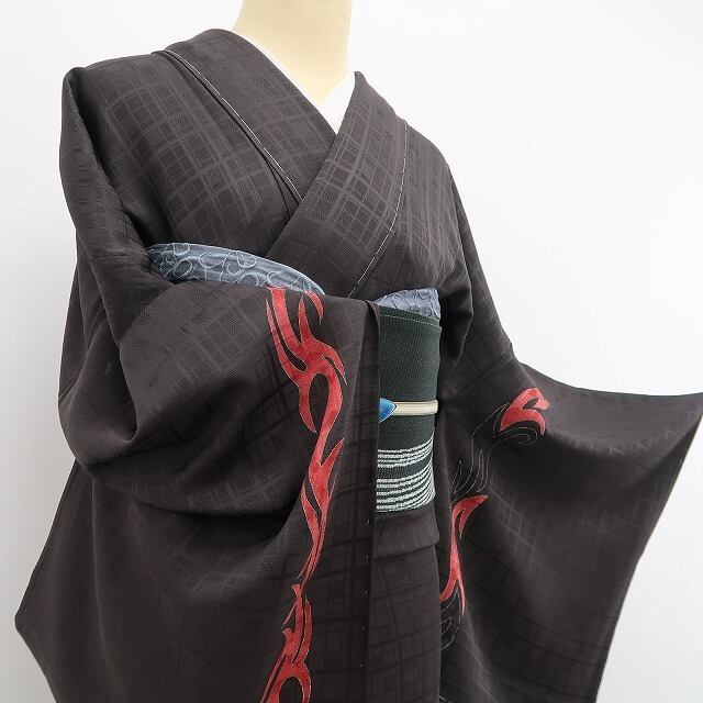 シックな鉄黒色の地全面に繋がれたアシンメトリーなデザイン格子、縦状に巧みな構図で色を挿すアブストラクトなデザインモチーフ、単衣の透明感に醸し出されるえも言われぬお洒落感は必見!ダイレクトにセンスの良さを感じさせてくれる一枚…正絹のしっとりとした風合いが着物の味わいを一段と馴染みやすい趣に変えています。