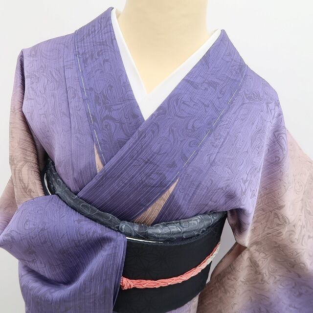 縦状の構図で濃淡を映す柔らかな青紫色と紅藤色の彩色、彩りに艶めいた表情を魅せる墨流しの流線模様、それは斬新な感性に培われた創作着物の世界観、シンプルなテーマながら古来の技法を新たな視点でデザイン化したひと品…素敵です。