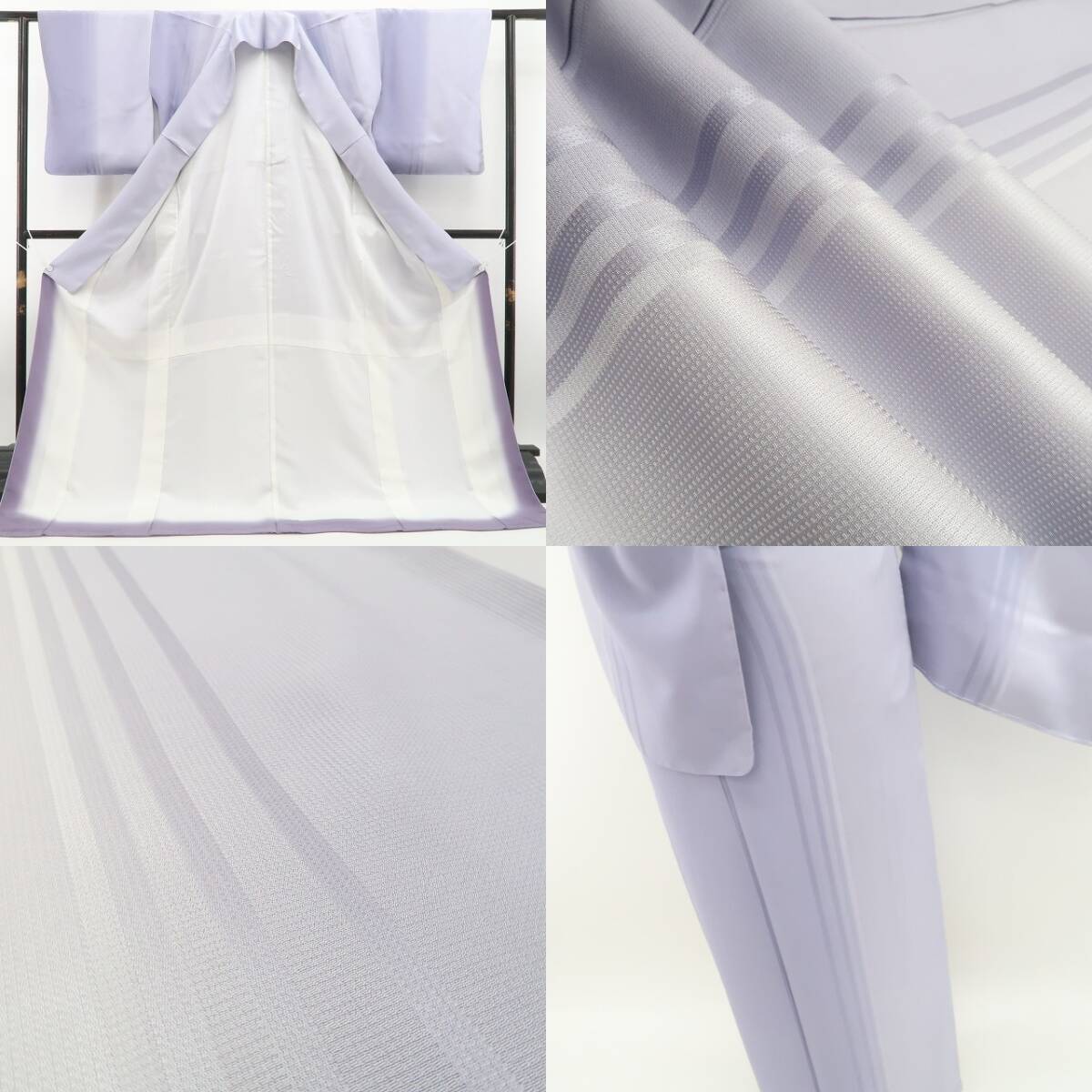 藤紫色の彩色が誘うこの上ない温もり、柔らかなグラデーションに浮かび上がる精微な縞のデザインライン、それは暈しの技に馴染みの縦縞が創り出すお洒落着物の粋な奥行、どこか親しみのある表情は小紋ならでは、モダンなタッチで描き込まれた色柄が着物に艶を吹き込むかのような趣で美しい表情を奏でています。