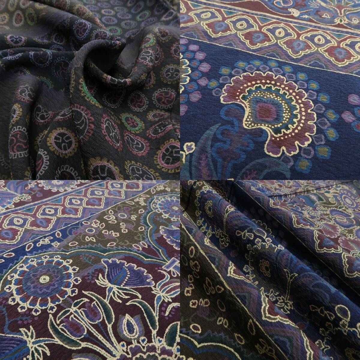 丸みある黒を基調に多彩な色味が創り出す艶色の表情、色柄の濃淡に揺らぎを魅せる精微な更紗模様の美しさ、それは豊かな温もりに深みの幻想を描く前田仁仙の世界観、“ようこそ仁仙更紗の世界へ!”、何とも言えない独特の色合いが着物の奥行を一段と美しく際立たせています。