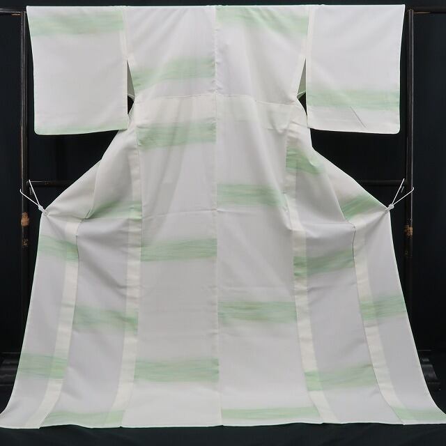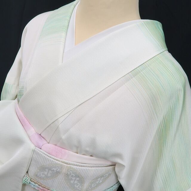 楚々とした艶を放つ生成り色と薄萌黄色の濃淡、それは横段状の構図に巧みな色挿しが創り出す“今をときめく洗練の風”、卓越したデザインセンスでエレガントに個性の美を演出するひと品、大人の女性にだけ着こなすことができる極上の味わいをお楽しみいただけます。