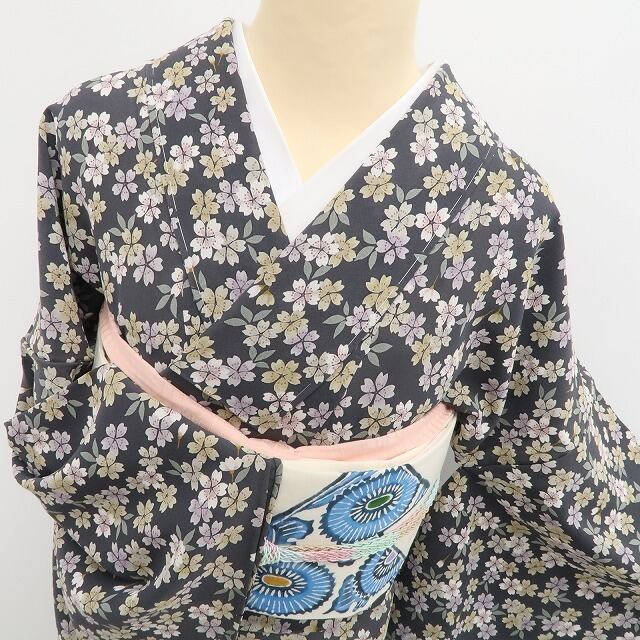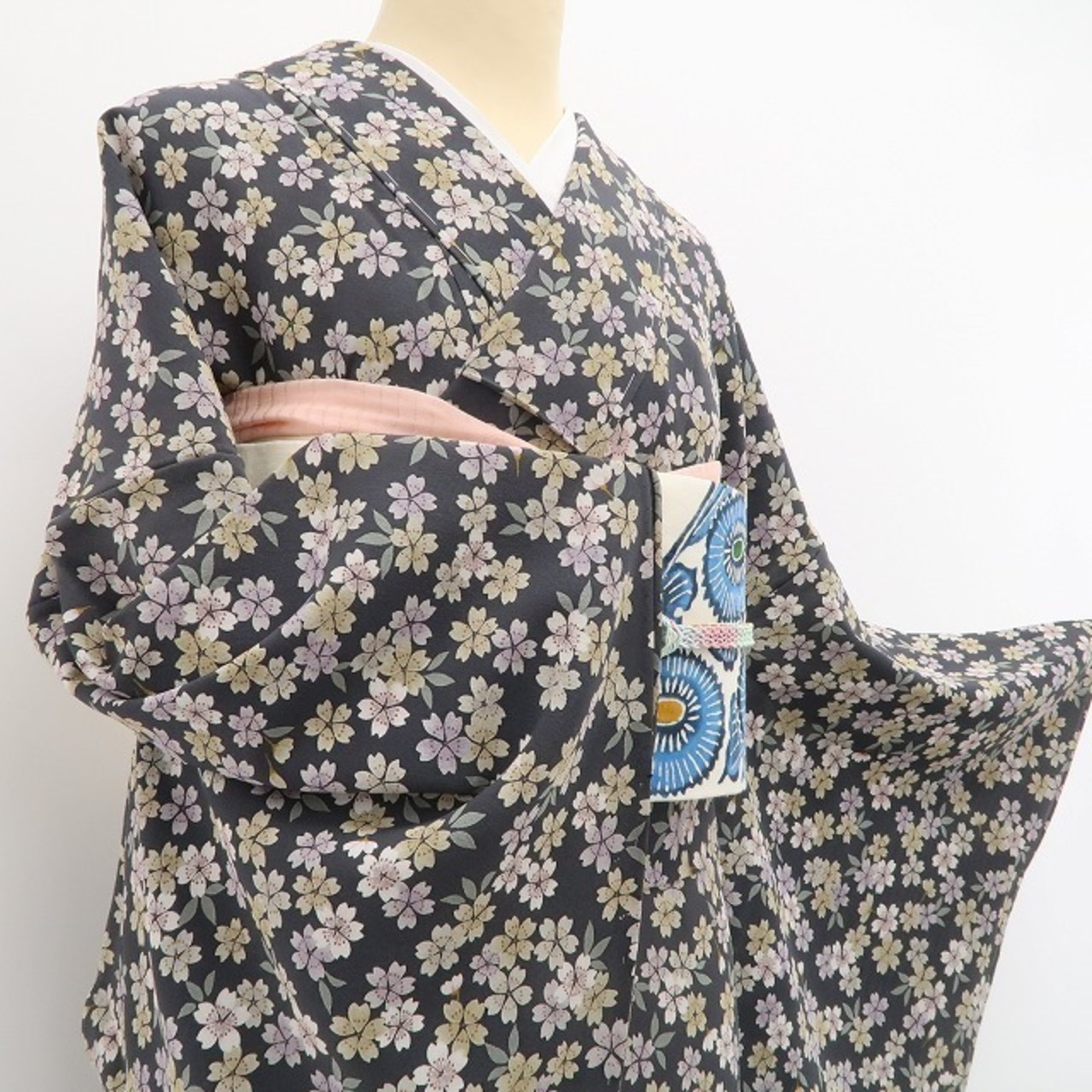 こちらのお着物は、ダルトーンの彩色でモダン創作を意識したデザイン性の高い“桜尽くし”の柄行きを込めております。モダン創作着物は、お洒落を楽しむお召し物として、また和装の幅を広げる意味からも一枚お手元に置かれると重宝します。