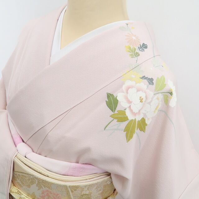 桜色の温もりが放つ楚々とした艶、彩りの濃淡にまるで絵画のように描き込まれた牡丹の花、慎ましくも華やかに浮かび上がるその表情は“心射止める花の眼差し”そのもの、それは古典モダンに艶を挿す創作着物の世界観、素敵です。