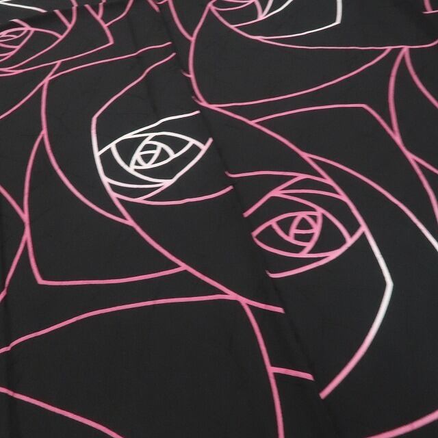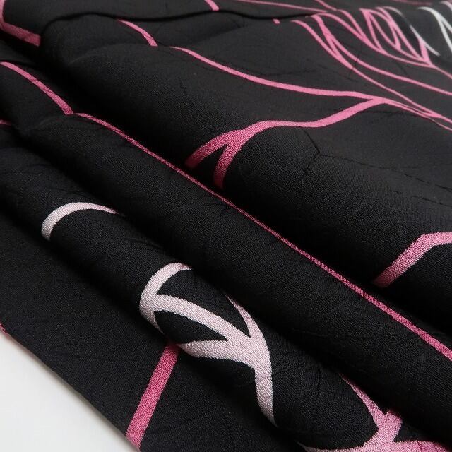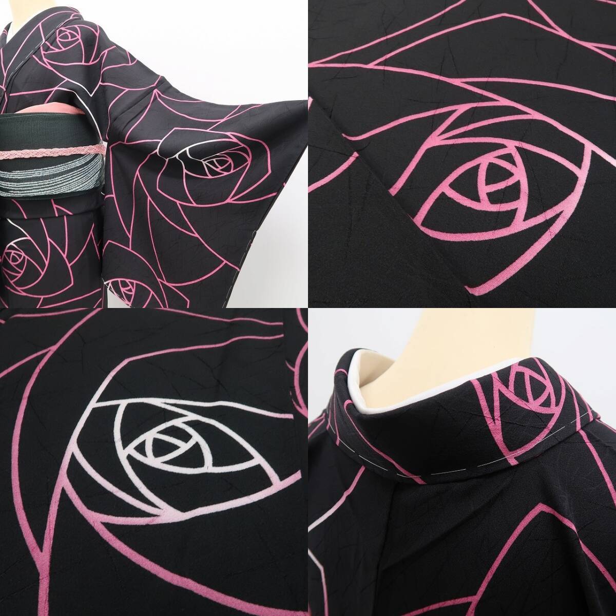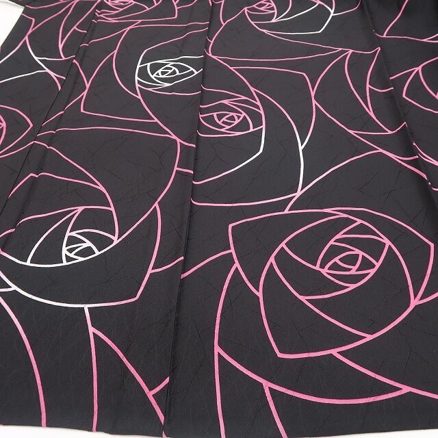黒の色地全面にデッサン調に描き込まれたモダンな薔薇のデザインモチーフ、洗練のフォルムに醸し出されるえも言われぬお洒落感は必見!シンプルに、そしてダイレクトにセンスの良さを感じさせてくれる一枚…正絹のしっとりとした風合いが着物の味わいを一段と馴染みやすい趣に変えています。