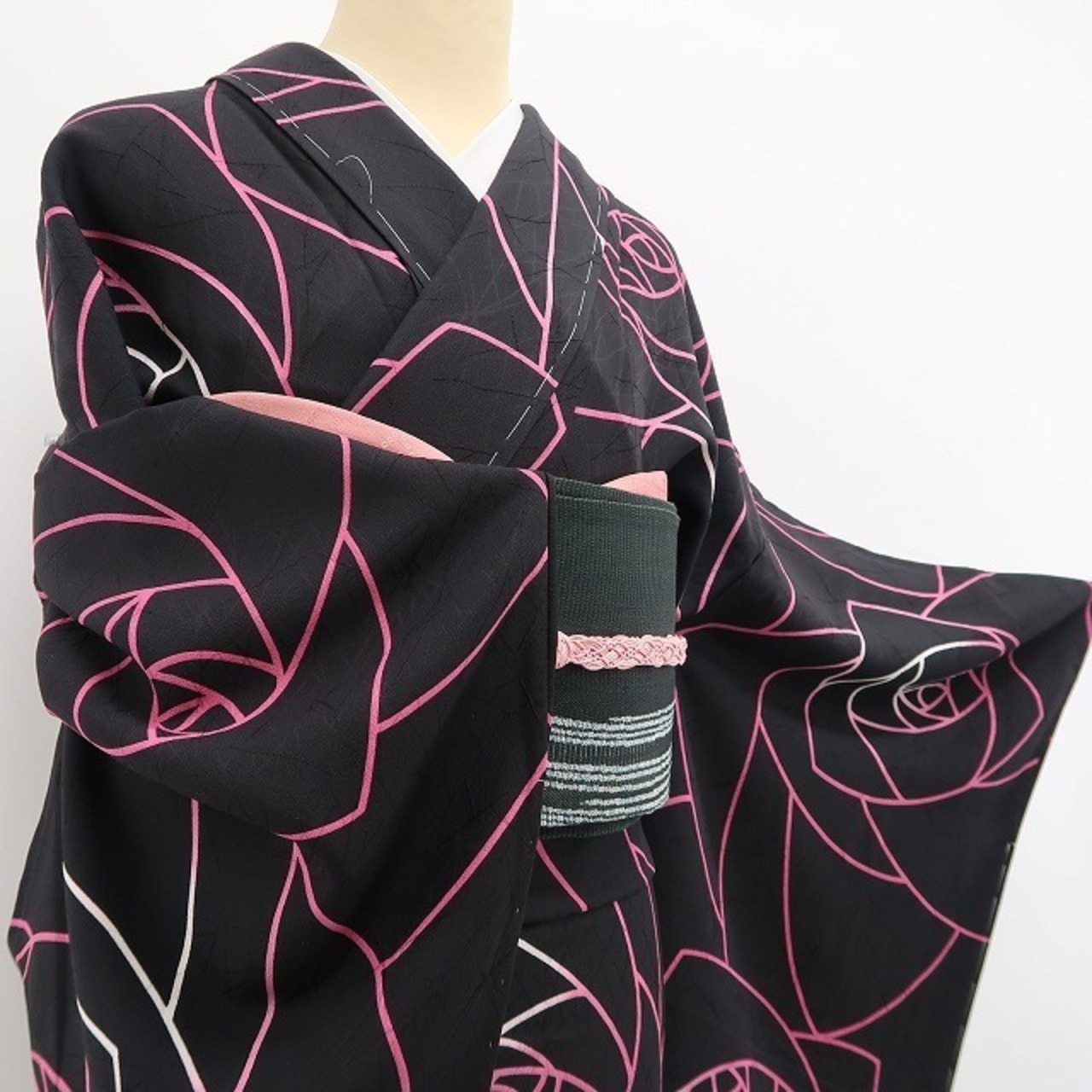 こちらのお着物は、ダークトーンの彩色で創作着物の奥行にフォーカスしたバラの花柄を和モダンにデザイン化しています…モダン創作着物は、お洒落を楽しむお召し物として、また和装の幅を広げる意味からも一枚お手元に置かれると重宝します。