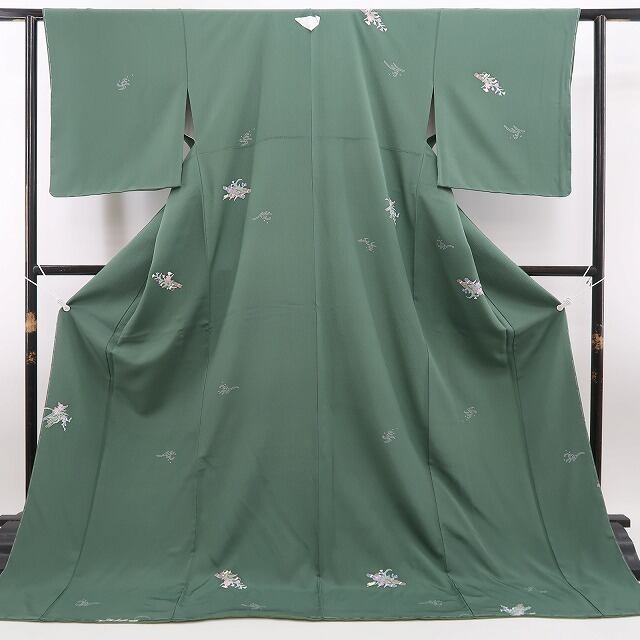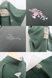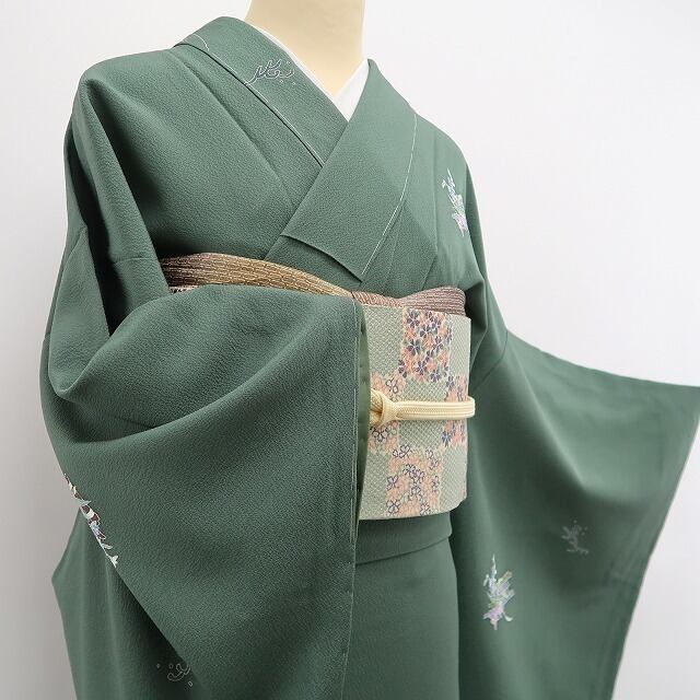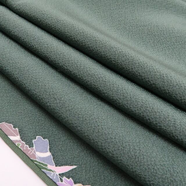 趣ある緑青色の色地に広がる大人びた艶、巧みな彩色に散らされた愛らしい花小柄のデザインモチーフ、意匠に醸し出されるえも言われぬお洒落感は格別!それは確かな染め技が創り出す手描き友禅の魅力そのもの、正に“歴史を秘めて甦る大人小紋の新しい風”、素敵です。