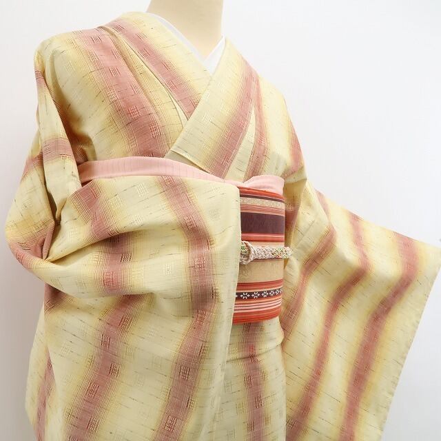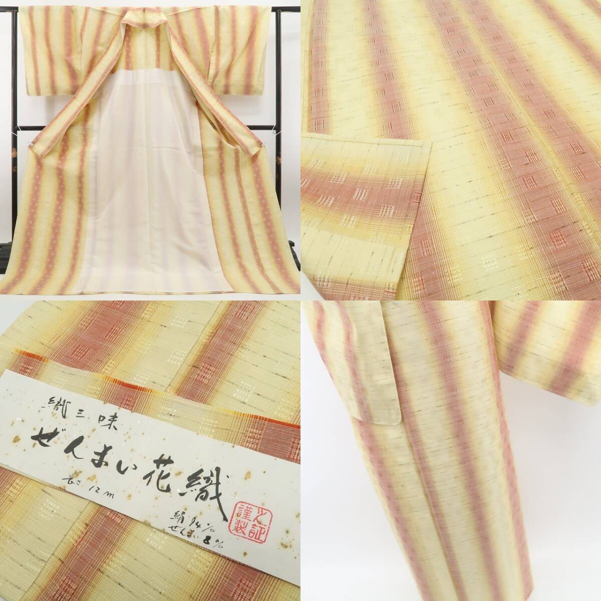 丸みを帯びた女郎花色と洗朱色の濃淡に縦状の構図で描き込まれた浮き織模様の美しさ、それは紬地に花織独特の四角模様が創り出す心地よい風、どれをとっても溢れ出す清々しさはぜんまい紬ならでは、季節の装いにお奨めです。