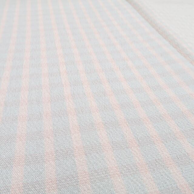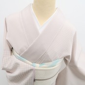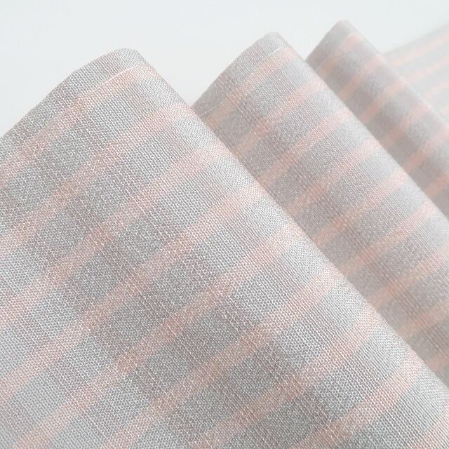 楚々としたグレーの色地に桜色の彩色で交差するモダンチェックのデザインライン、シンメトリーに繋がれた洒落格子が醸し出すこの上ない和の温もり、それは創作お召の粋な奥行…手くくり手摺り込みによる絣糸を一本一本合わせながら織り上げるお召の味わい、独特のしっとりとした風合いが着物の味わいを一段と馴染みやすい趣に変えています。