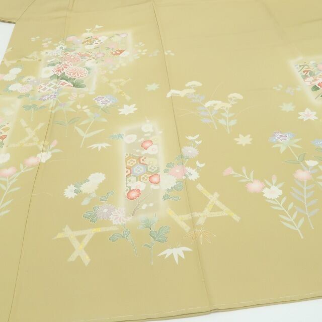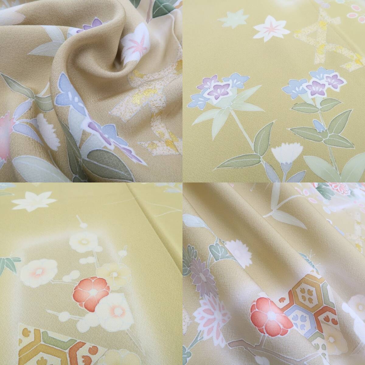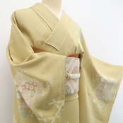 落ち着いた砥の粉色の優彩に広がる心地よい温もり、巧みな構図で散らされた花と和柄の組み模様、丸みの表情が醸し出すえも言われぬお洒落感、そして金駒刺繍が添える極上の艶、それは“美しい着物に袖を通す至福のひと時”…落ち着きを魅せる女性らしさに溢れ出す和の風情を存分にお感じいただけることでしょう。