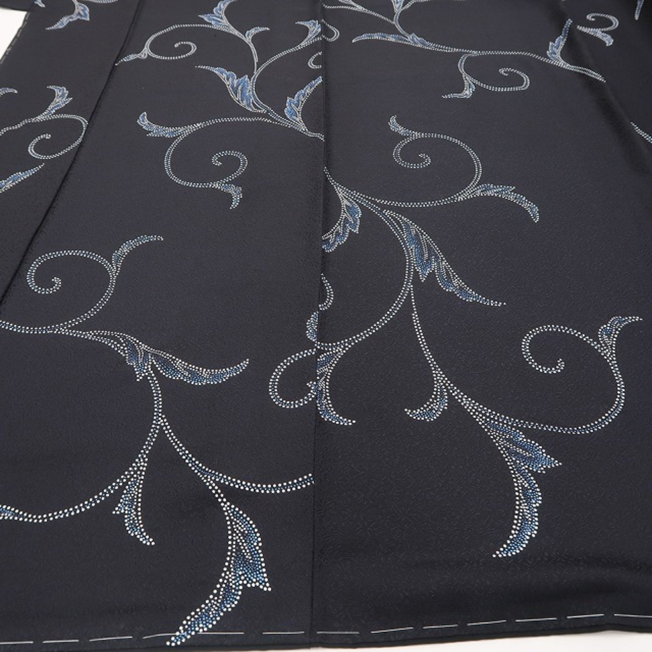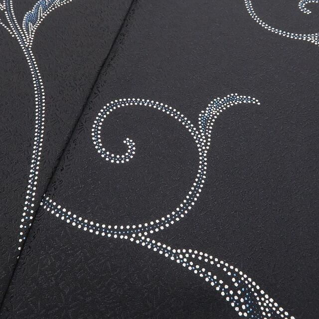 シックな黒の色地に浮かび上がる唐草の陰影、シンプルながら流線に揺らぐその艶めいた表情は必見の価値あり!それは京印伝の技が創り出す優しい視覚のインパクト、正に“歴史を秘めて甦る大人小紋の新しい風”、素敵です。