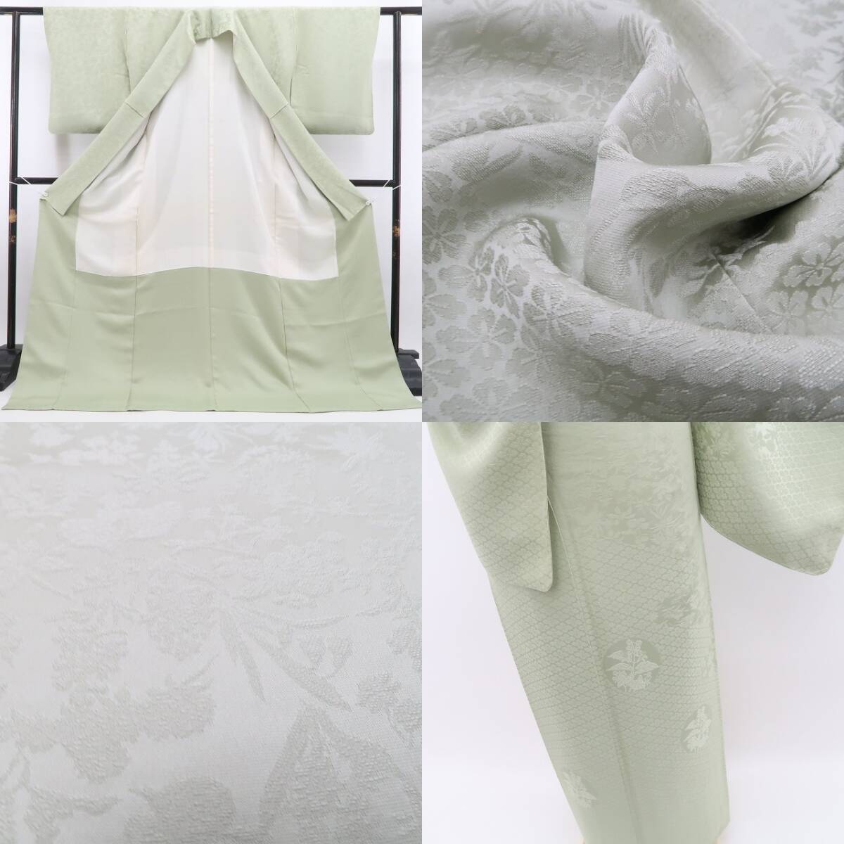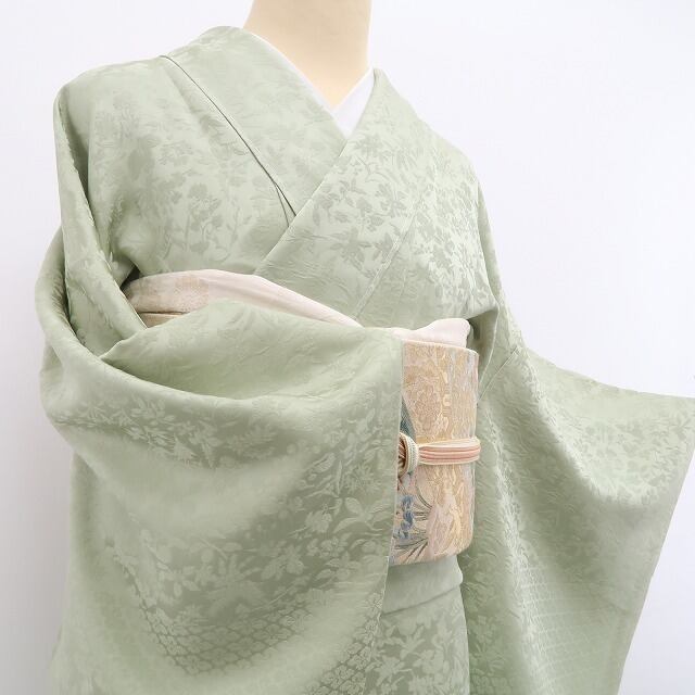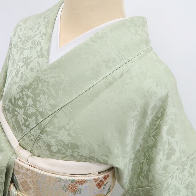 若葉色(アップの画像は少々お色が異なって見えますので、着付け画像をご参考ください)の彩色に刻み込まれた花葉の陰影、彩りに同化しながら鮮烈なインパクトを残すその表情は必見!シンプルなテーマながらも極上に大人のセンスを感じさせてくれるひと品、ほのかな色香に染まりながら貴女へ上質の高揚感を届けてくれます。