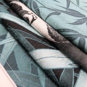繊細な表情を秘め、銀色の巧みな美しさを輝かせ、ざわざわ、ざわざわと笹が揺らめき、巧みな奥行きを生み出しながら茂る竹、その自然味の中でひと際目を引く白黒のふわふわとしたシルエットに優しい眼差しで可愛らしい子を抱く母パンダが息づき、その愛しくて愛しくてたまらない心が溢れる姿は、竹も味方につけて守られているかのよう。