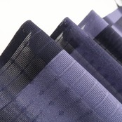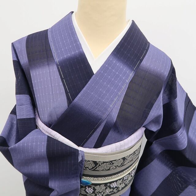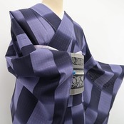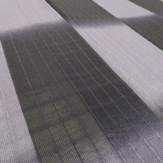 深紫色と藤納戸色の濃淡に抜ける心地よい風、シンメトリーな構図で描き込まれたデザイン市松の洒落格子、それは紗の透明感に心地よいインパクトを残す素敵な風の贈り物、四角形の連続が創り出す市松文様の魔法、配色を変えることで無限に変化する文様に生まれ変わります。