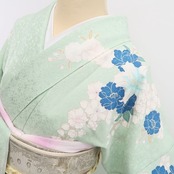 裏葉柳色の彩色に広がる爽やかかつ柔らかな表情、巧みな構図に染め出された美しい花々の一景、桜と百合が醸し出す上品で可憐な趣。いつまでもうっとりと眺めていたくなる美しい彩色と構図は、着る人も見る人も癒してくれます。