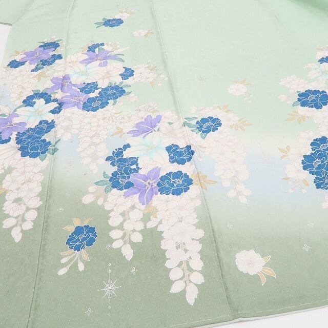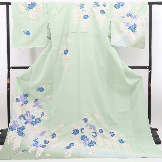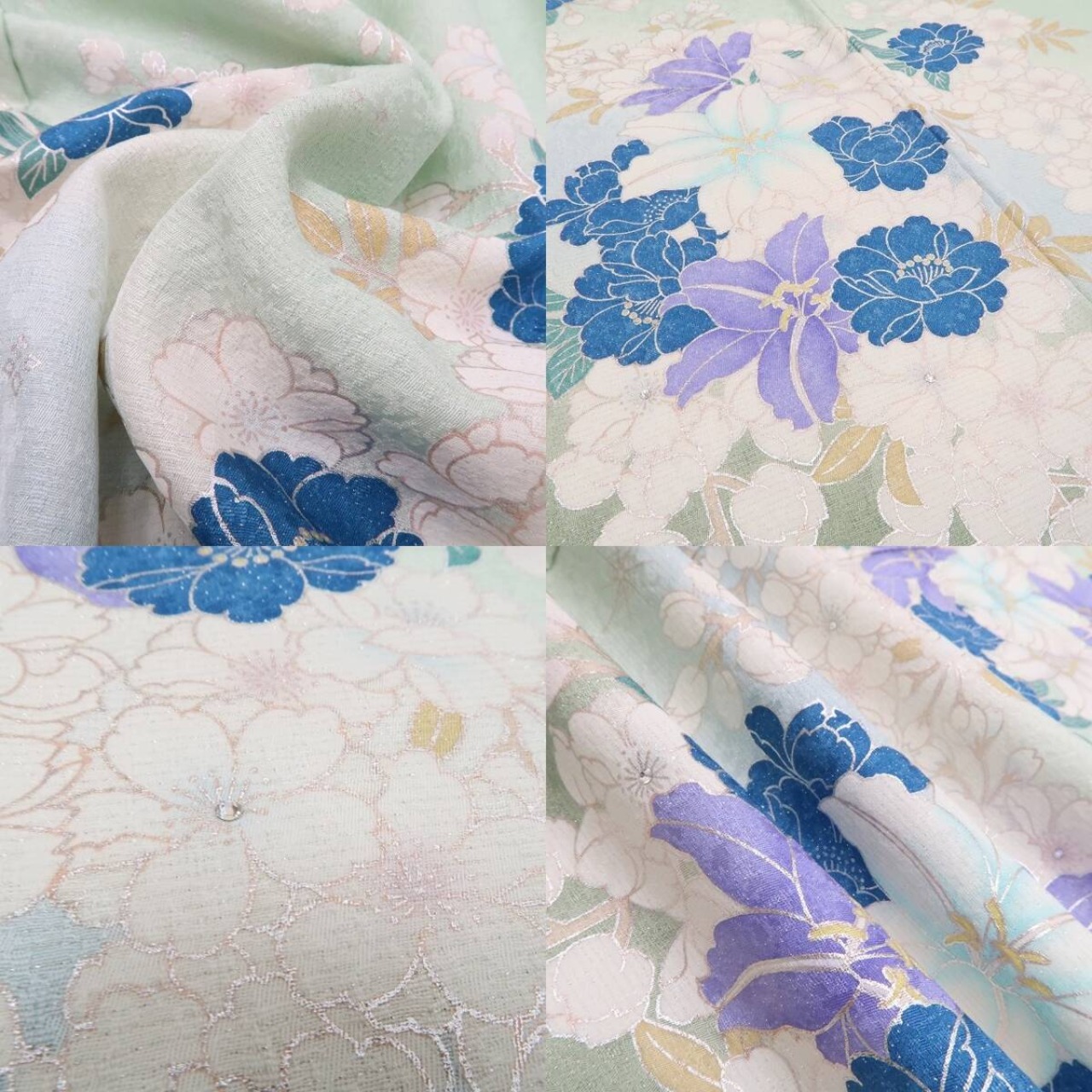 こちらのお着物は、優しい裏葉柳色の生地に、桜と百合が咲き誇る訪問着でございます。季節を感じながら美しい着物に袖を通す至福のひと時、高級感とともに思わず惹きこまれるその気品ある姿にきっとご満足いただけるでしょう。