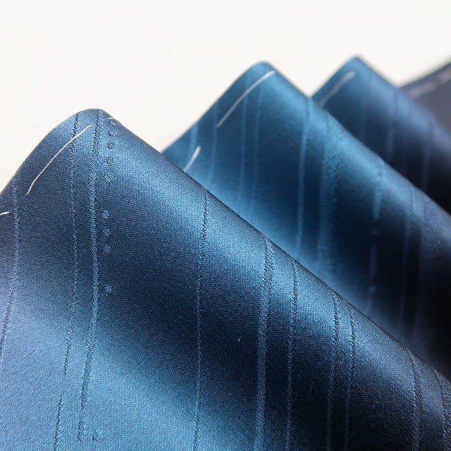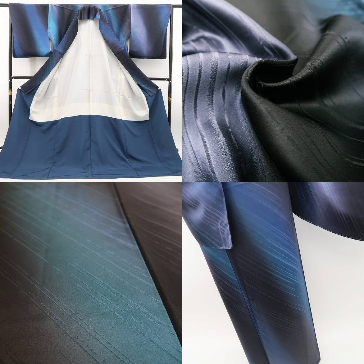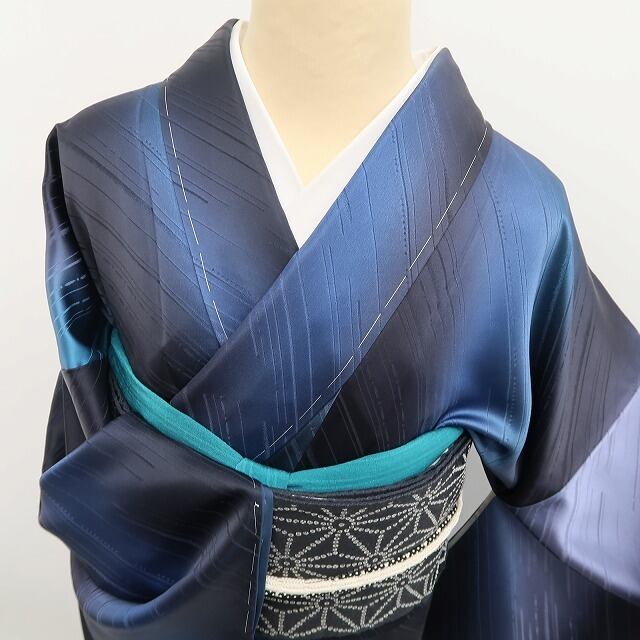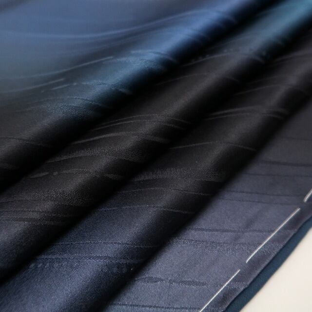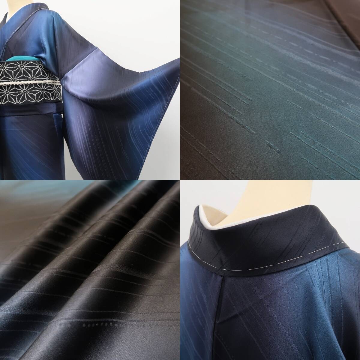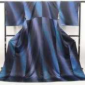 光沢ある藍鉄色と青藍色の濃淡が創り出すどこか艶めいた表情、斜めの構図で陰影を映す風を趣くデザインライン、洗練されたデザインセンスでエレガントに個性の美を演出するひと品、それは“今をときめく創作小紋の魅力”そのもの、お洒落を先取る貴女にお勧め!