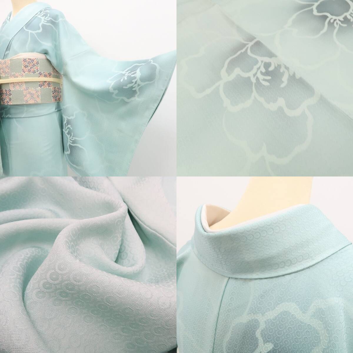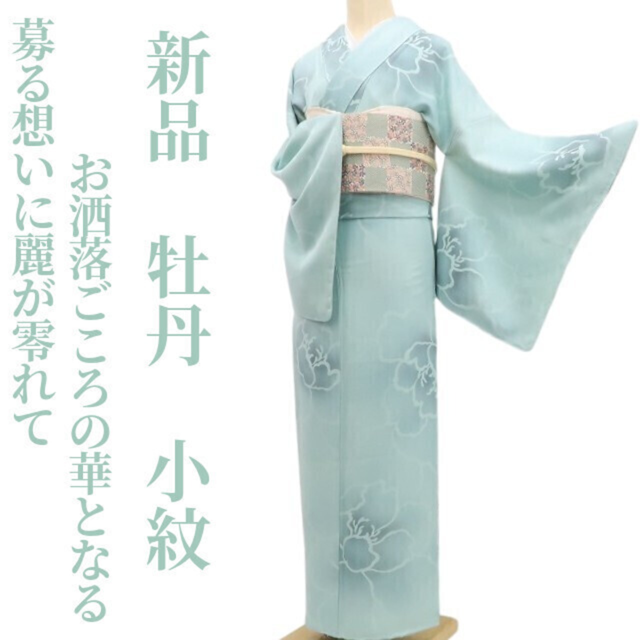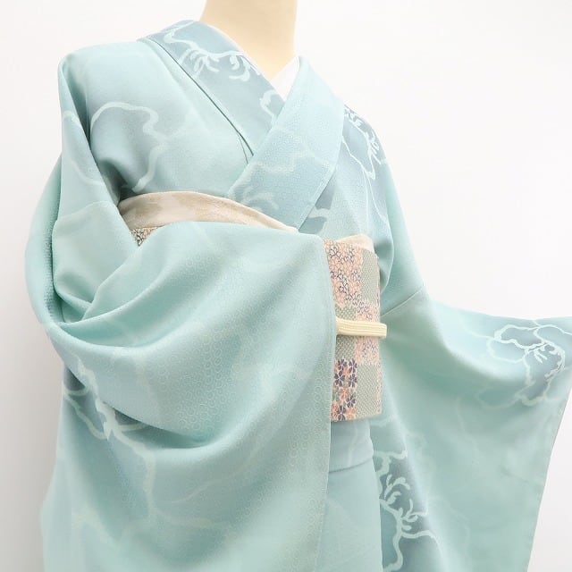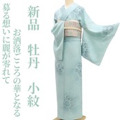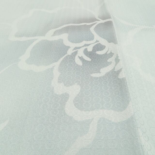柔らかな白群色の色地に濃淡の構図で浮かび上がる可憐な牡丹のシルエット、丸みのフォルムに醸し出されるえも言われぬお洒落感は格別!それは花の温もりに色挿しの慎ましさが添える楚々とした着物の奥行、季節の装いに…美の極みに触れ至極の着心地があなたに充実したひと時を運んでくれることでしょう。