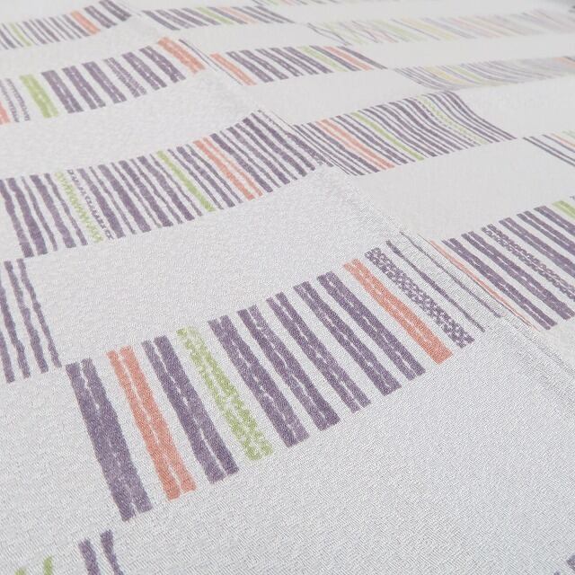 温もりある藤鼠色の彩色が放つ楚々とした艶、長方格子に込められた洗練モダンなデザインモチーフ、横段状の構図に揺らぐその表情は今をときめく創作小紋の魅力そのもの、正に“貴女を包む新しい日常”、柄行を微細なコントラストで大人色に表現したひと品、お奨めです。