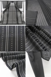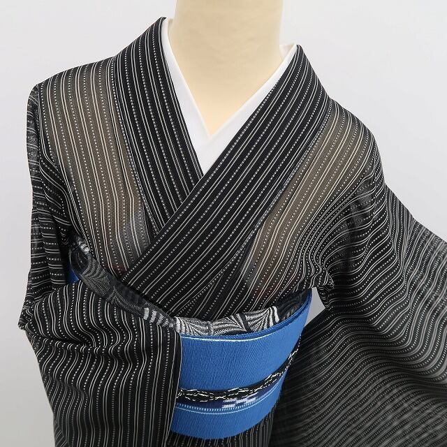 黒地にすっきりと引かれた縦縞。こちらのお着物は、シャープで洗練された印象を与える、紗のお召でございます。