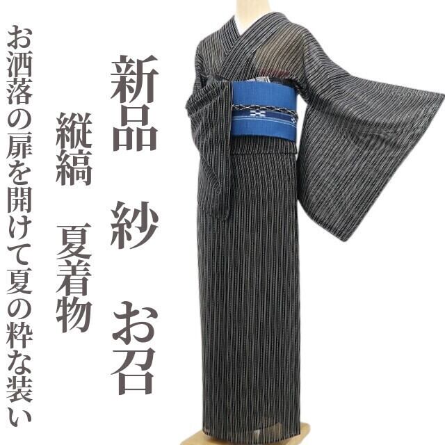 新品 紗 縦縞 夏着物 仕付け糸付”お洒落の扉を開けて、夏の粋な装い”お召 5737