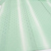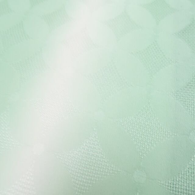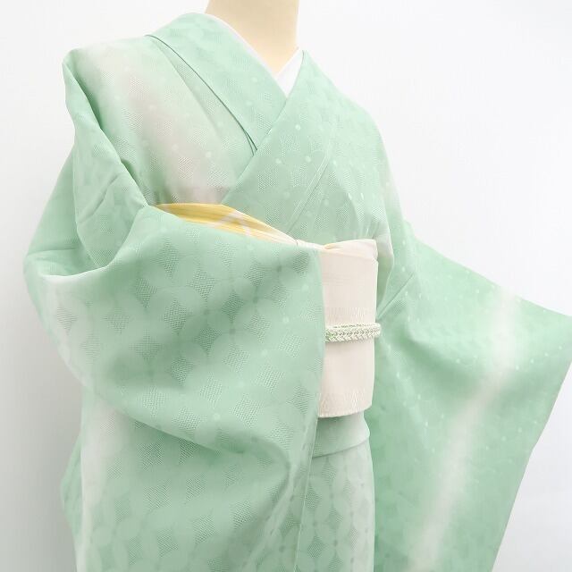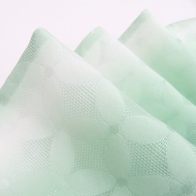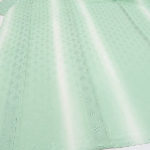 暈しの技が活きる薄萌葱色の濃淡全面に朧げな表情で浮かび上がるデザイン七宝の繋ぎ柄、それは紗の透明感に巧みな意匠が創り出すこの上ない涼味、従来ある古典柄を新たな視点でデザイン化したひと品、夏小紋の爽やかな風とともに貴女の装いの満足度を上げてくれること間違いなし!
